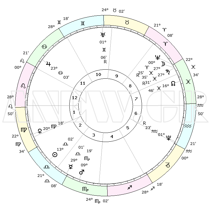 | ΘΕΣΕΙΣ ΠΛΑΝΗΤΩΝ ΑΣΤΡΟΛΟΓΙΚΟΥ ΧΑΡΤΗ ΤΗΣ ΣΤΙΓΜΗΣ ΑΥΤΗΣ | | Πλανήτης | Ζώδιο | Μοίρες | Δεκαήμ. | Σε οίκο | Απόκλιση | | Ακμές των οίκων | Ηλιος | Ζυγός | 12°57' | Δεύτερο | 3 | 05 S 07 | | 1ος | 06°18' | Λέων | Σελήνη | Ιχθείς | 26°28' | Τρίτο | 9 | 00 S 43 | | 2ος | 27°48' | Λέων | Ερμής | Ζυγός | 28°54' | Τρίτο | 4 | 11 S 44 | | 3ος | 23°42' | Παρθένος | Αφροδίτη | Παρθένος | 20°12' | Τρίτο | 2 | 05 N 10 | | 4ος | 25°26' | Ζυγός | Αρης | Σκορπιός | 09°16' | Πρώτο | 4 | 14 S 42 | | 5ος | 01°15' | Τοξότης | Δίας | Καρκίνος | 23°02' | Τρίτο | 12 | 21 N 30 | | 6ος | 05°57' | Αιγόκερως | Κρόνος | Ιχθείς | 27°31'R | Τρίτο | 9 | 03 S 17 | | 7ος | 06°18' | Υδροχόος | Ουρανός | Δίδυμοι | 01°06'R | Πρώτο | 10 | 20 N 10 | | 8ος | 27°48' | Υδροχόος | Ποσειδώνας | Κριός | 00°25'R | Πρώτο | 9 | 01 S 06 | | 9ος | 23°42' | Ιχθείς | Πλούτωνας | Υδροχόος | 01°23'R | Πρώτο | 6 | 23 S 32 | | 10ος | 25°26' | Κριός | Β. Δεσμός | Ιχθείς | 16°47' | Δεύτερο | 8 | 05 S 13 | | 11ος | 01°15' | Δίδυμοι | Ωροσκόπος | Λέων | 06°18' | Πρώτο | | | 12ος | 05°57' | Καρκίνος | Μεσουράνημα | Κριός | 25°26' | Τρίτο | | | |