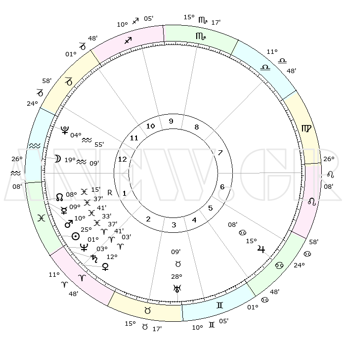 | | ΘΕΣΕΙΣ ΠΛΑΝΗΤΩΝ ΑΣΤΡΟΛΟΓΙΚΟΥ ΧΑΡΤΗ ΤΗΣ ΣΤΙΓΜΗΣ ΑΥΤΗΣ | | | | Πλανήτης | Ζώδιο | Μοίρες | Δεκαήμ. | Σε οίκο | Απόκλιση | | Ακμές των οίκων | | Ηλιος | Ιχθείς | 25°30' | Τρίτο | 2 | 01 S 47 | | 1ος | 28°36' | Αιγόκερως | | Σελήνη | Υδροχόος | 18°24' | Δεύτερο | 1 | 17 S 05 | | 2ος | 12°28' | Ιχθείς | | Ερμής | Ιχθείς | 09°39'R | Πρώτο | 1 | 05 S 57 | | 3ος | 21°08' | Κριός | | Αφροδίτη | Κριός | 11°59' | Δεύτερο | 2 | 03 N 48 | | 4ος | 19°50' | Ταύρος | | Αρης | Ιχθείς | 10°38' | Δεύτερο | 1 | 08 S 35 | | 5ος | 12°42' | Δίδυμοι | | Δίας | Καρκίνος | 15°08' | Δεύτερο | 6 | 22 N 56 | | 6ος | 04°05' | Καρκίνος | | Κρόνος | Κριός | 03°41' | Πρώτο | 2 | 00 S 29 | | 7ος | 28°36' | Καρκίνος | | Ουρανός | Ταύρος | 28°09' | Τρίτο | 4 | 19 N 34 | | 8ος | 12°28' | Παρθένος | | Ποσειδώνας | Κριός | 01°36' | Πρώτο | 2 | 00 S 34 | | 9ος | 21°08' | Ζυγός | | Πλούτωνας | Υδροχόος | 04°55' | Πρώτο | 1 | 22 S 49 | | 10ος | 19°50' | Σκορπιός | | Β. Δεσμός | Ιχθείς | 08°15' | Πρώτο | 1 | 08 S 29 | | 11ος | 12°42' | Τοξότης | | Ωροσκόπος | Αιγόκερως | 28°36' | Τρίτο | | | 12ος | 04°05' | Αιγόκερως | | Μεσουράνημα | Σκορπιός | 19°50' | Δεύτερο | | | |