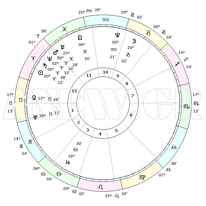 | | ΘΕΣΕΙΣ ΠΛΑΝΗΤΩΝ ΑΣΤΡΟΛΟΓΙΚΟΥ ΧΑΡΤΗ ΤΗΣ ΣΤΙΓΜΗΣ ΑΥΤΗΣ | | | | Πλανήτης | Ζώδιο | Μοίρες | Δεκαήμ. | Σε οίκο | Απόκλιση | | Ακμές των οίκων | | Ηλιος | Κριός | 20°12' | Τρίτο | 2 | 07 N 54 | | 1ος | 19°07' | Υδροχόος | | Σελήνη | Αιγόκερως | 18°37' | Δεύτερο | 11 | 26 S 02 | | 2ος | 04°55' | Κριός | | Ερμής | Ιχθείς | 23°16' | Τρίτο | 1 | 04 S 49 | | 3ος | 09°49' | Ταύρος | | Αφροδίτη | Ταύρος | 12°47' | Δεύτερο | 3 | 15 N 37 | | 4ος | 05°26' | Δίδυμοι | | Αρης | Κριός | 00°12' | Πρώτο | 1 | 00 S 51 | | 5ος | 27°16' | Δίδυμοι | | Δίας | Καρκίνος | 16°29' | Δεύτερο | 5 | 22 N 47 | | 6ος | 19°50' | Καρκίνος | | Κρόνος | Κριός | 06°47' | Πρώτο | 2 | 00 N 44 | | 7ος | 19°07' | Λέων | | Ουρανός | Ταύρος | 29°11' | Τρίτο | 3 | 19 N 48 | | 8ος | 04°55' | Ζυγός | | Ποσειδώνας | Κριός | 02°33' | Πρώτο | 1 | 00 S 11 | | 9ος | 09°49' | Σκορπιός | | Πλούτωνας | Υδροχόος | 05°21' | Πρώτο | 12 | 22 S 47 | | 10ος | 05°26' | Τοξότης | | Β. Δεσμός | Ιχθείς | 06°55' | Πρώτο | 1 | 08 S 58 | | 11ος | 27°16' | Τοξότης | | Ωροσκόπος | Υδροχόος | 19°07' | Δεύτερο | | | 12ος | 19°49' | Αιγόκερως | | Μεσουράνημα | Τοξότης | 05°26' | Πρώτο | | | |