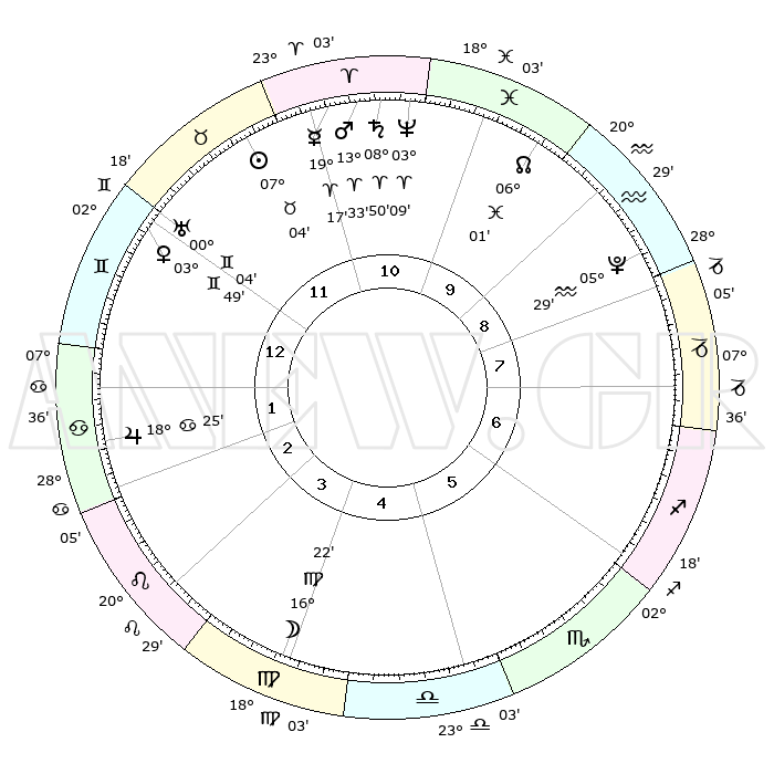 | | ΘΕΣΕΙΣ ΠΛΑΝΗΤΩΝ ΑΣΤΡΟΛΟΓΙΚΟΥ ΧΑΡΤΗ ΤΗΣ ΣΤΙΓΜΗΣ ΑΥΤΗΣ | | | | Πλανήτης | Ζώδιο | Μοίρες | Δεκαήμ. | Σε οίκο | Απόκλιση | | Ακμές των οίκων | | Ηλιος | Ταύρος | 07°00' | Πρώτο | 12 | 13 N 51 | | 1ος | 16°41' | Δίδυμοι | | Σελήνη | Παρθένος | 15°34' | Δεύτερο | 4 | 05 N 01 | | 2ος | 08°44' | Καρκίνος | | Ερμής | Κριός | 19°11' | Δεύτερο | 11 | 05 N 24 | | 3ος | 29°59' | Καρκίνος | | Αφροδίτη | Δίδυμοι | 03°45' | Πρώτο | 12 | 21 N 37 | | 4ος | 24°24' | Λέων | | Αρης | Κριός | 13°30' | Δεύτερο | 11 | 04 N 29 | | 5ος | 25°57' | Παρθένος | | Δίας | Καρκίνος | 18°24' | Δεύτερο | 2 | 22 N 33 | | 6ος | 06°09' | Σκορπιός | | Κρόνος | Κριός | 08°50' | Πρώτο | 11 | 01 N 31 | | 7ος | 16°41' | Τοξότης | | Ουρανός | Δίδυμοι | 00°04' | Πρώτο | 12 | 20 N 00 | | 8ος | 08°44' | Αιγόκερως | | Ποσειδώνας | Κριός | 03°09' | Πρώτο | 11 | 00 N 02 | | 9ος | 29°59' | Αιγόκερως | | Πλούτωνας | Υδροχόος | 05°29' | Πρώτο | 9 | 22 S 48 | | 10ος | 24°24' | Υδροχόος | | Β. Δεσμός | Ιχθείς | 06°01' | Πρώτο | 10 | 09 S 18 | | 11ος | 25°57' | Ιχθείς | | Ωροσκόπος | Δίδυμοι | 16°41' | Δεύτερο | | | 12ος | 06°09' | Ταύρος | | Μεσουράνημα | Υδροχόος | 24°24' | Τρίτο | | | |