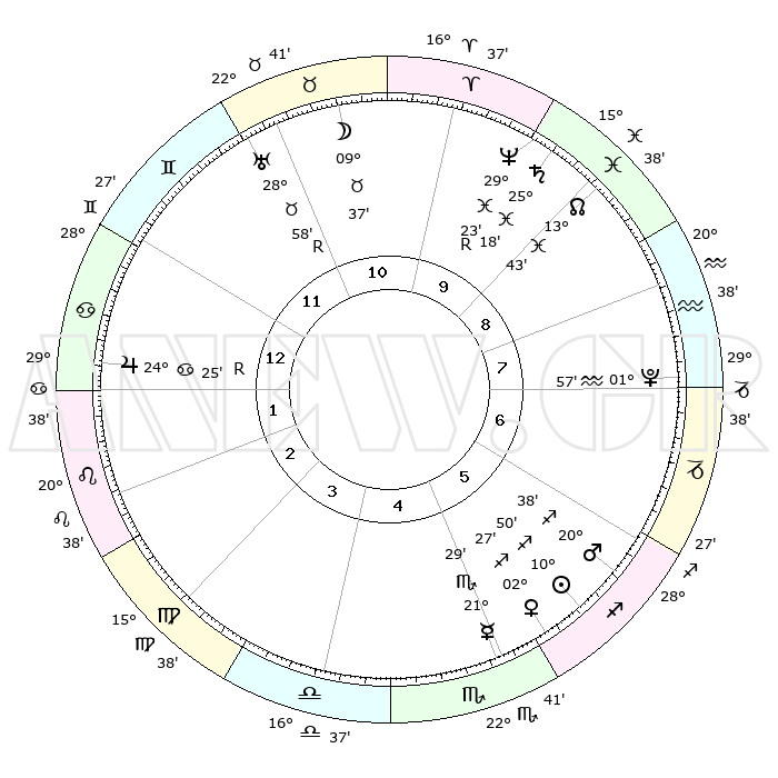 | | ΘΕΣΕΙΣ ΠΛΑΝΗΤΩΝ ΑΣΤΡΟΛΟΓΙΚΟΥ ΧΑΡΤΗ ΤΗΣ ΣΤΙΓΜΗΣ ΑΥΤΗΣ | | | | Πλανήτης | Ζώδιο | Μοίρες | Δεκαήμ. | Σε οίκο | Απόκλιση | | Ακμές των οίκων | | Ηλιος | Τοξότης | 10°49' | Δεύτερο | 5 | 22 S 04 | | 1ος | 20°48' | Καρκίνος | | Σελήνη | Ταύρος | 09°10' | Πρώτο | 10 | 18 N 26 | | 2ος | 11°22' | Λέων | | Ερμής | Σκορπιός | 21°28' | Τρίτο | 5 | 15 S 36 | | 3ος | 05°12' | Παρθένος | | Αφροδίτη | Τοξότης | 02°24' | Πρώτο | 5 | 20 S 01 | | 4ος | 04°57' | Ζυγός | | Αρης | Τοξότης | 20°36' | Τρίτο | 6 | 23 S 47 | | 5ος | 10°58' | Σκορπιός | | Δίας | Καρκίνος | 24°25'R | Τρίτο | 1 | 21 N 23 | | 6ος | 18°13' | Τοξότης | | Κρόνος | Ιχθείς | 25°18' | Τρίτο | 9 | 04 S 02 | | 7ος | 20°48' | Αιγόκερως | | Ουρανός | Ταύρος | 28°58'R | Τρίτο | 11 | 19 N 43 | | 8ος | 11°22' | Υδροχόος | | Ποσειδώνας | Ιχθείς | 29°23'R | Τρίτο | 9 | 01 S 29 | | 9ος | 05°12' | Ιχθείς | | Πλούτωνας | Υδροχόος | 01°57' | Πρώτο | 7 | 23 S 23 | | 10ος | 04°57' | Κριός | | Β. Δεσμός | Ιχθείς | 13°43' | Δεύτερο | 9 | 06 S 24 | | 11ος | 10°58' | Ταύρος | | Ωροσκόπος | Καρκίνος | 20°48' | Τρίτο | | | 12ος | 18°13' | Δίδυμοι | | Μεσουράνημα | Κριός | 04°57' | Πρώτο | | | |