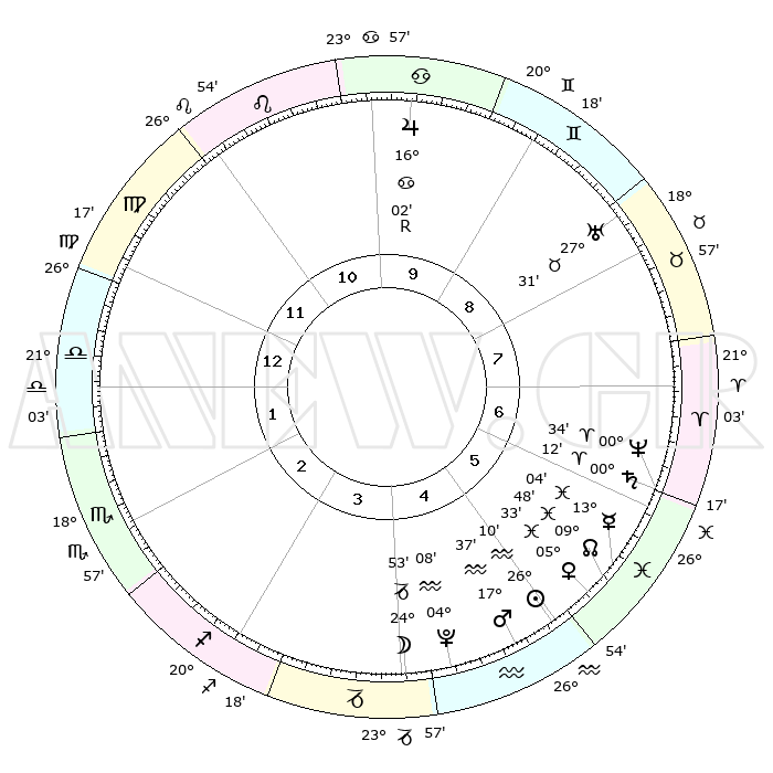 | | ΘΕΣΕΙΣ ΠΛΑΝΗΤΩΝ ΑΣΤΡΟΛΟΓΙΚΟΥ ΧΑΡΤΗ ΤΗΣ ΣΤΙΓΜΗΣ ΑΥΤΗΣ | | | | Πλανήτης | Ζώδιο | Μοίρες | Δεκαήμ. | Σε οίκο | Απόκλιση | | Ακμές των οίκων | | Ηλιος | Υδροχόος | 26°01' | Τρίτο | 6 | 12 S 50 | | 1ος | 10°48' | Παρθένος | | Σελήνη | Αιγόκερως | 23°11' | Τρίτο | 5 | 25 S 10 | | 2ος | 05°45' | Ζυγός | | Ερμής | Ιχθείς | 12°52' | Δεύτερο | 7 | 06 S 45 | | 3ος | 05°15' | Σκορπιός | | Αφροδίτη | Ιχθείς | 05°23' | Πρώτο | 6 | 10 S 54 | | 4ος | 08°12' | Τοξότης | | Αρης | Υδροχόος | 17°30' | Δεύτερο | 6 | 16 S 37 | | 5ος | 11°45' | Αιγόκερως | | Δίας | Καρκίνος | 16°03'R | Δεύτερο | 11 | 22 N 48 | | 6ος | 13°00' | Υδροχόος | | Κρόνος | Κριός | 00°12' | Πρώτο | 7 | 01 S 54 | | 7ος | 10°48' | Ιχθείς | | Ουρανός | Ταύρος | 27°30' | Τρίτο | 9 | 19 N 25 | | 8ος | 05°45' | Κριός | | Ποσειδώνας | Κριός | 00°33' | Πρώτο | 7 | 00 S 59 | | 9ος | 05°15' | Ταύρος | | Πλούτωνας | Υδροχόος | 04°08' | Πρώτο | 5 | 22 S 57 | | 10ος | 08°12' | Δίδυμοι | | Β. Δεσμός | Ιχθείς | 09°48' | Πρώτο | 6 | 07 S 54 | | 11ος | 11°45' | Καρκίνος | | Ωροσκόπος | Παρθένος | 10°48' | Δεύτερο | | | 12ος | 13°00' | Λέων | | Μεσουράνημα | Δίδυμοι | 08°12' | Πρώτο | | | |