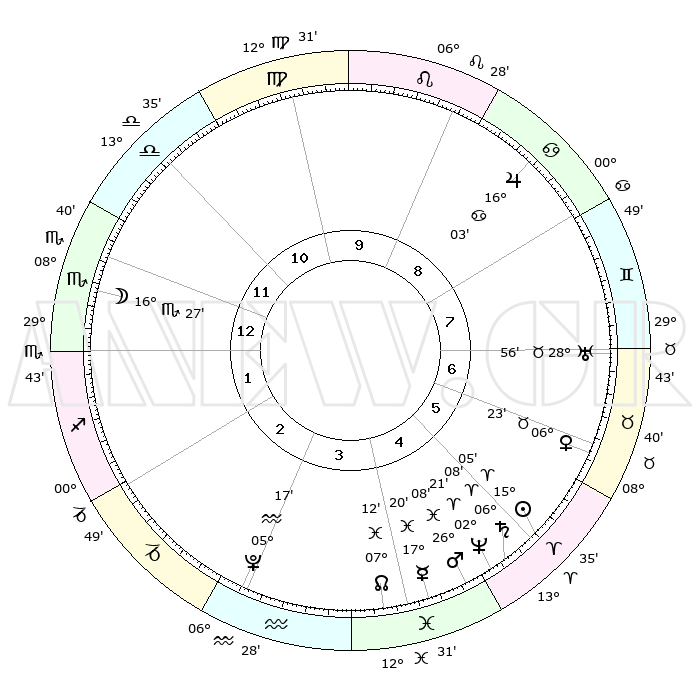 | | ΘΕΣΕΙΣ ΠΛΑΝΗΤΩΝ ΑΣΤΡΟΛΟΓΙΚΟΥ ΧΑΡΤΗ ΤΗΣ ΣΤΙΓΜΗΣ ΑΥΤΗΣ | | | | Πλανήτης | Ζώδιο | Μοίρες | Δεκαήμ. | Σε οίκο | Απόκλιση | | Ακμές των οίκων | | Ηλιος | Κριός | 14°57' | Δεύτερο | 6 | 05 N 53 | | 1ος | 20°35' | Ζυγός | | Σελήνη | Σκορπιός | 14°49' | Δεύτερο | 1 | 20 S 48 | | 2ος | 18°27' | Σκορπιός | | Ερμής | Ιχθείς | 17°12' | Δεύτερο | 5 | 06 S 44 | | 3ος | 19°46' | Τοξότης | | Αφροδίτη | Ταύρος | 06°14' | Πρώτο | 7 | 13 N 19 | | 4ος | 23°24' | Αιγόκερως | | Αρης | Ιχθείς | 26°02' | Τρίτο | 6 | 02 S 31 | | 5ος | 26°21' | Υδροχόος | | Δίας | Καρκίνος | 16°03' | Δεύτερο | 9 | 22 N 50 | | 6ος | 25°46' | Ιχθείς | | Κρόνος | Κριός | 06°07' | Πρώτο | 6 | 00 N 28 | | 7ος | 20°35' | Κριός | | Ουρανός | Ταύρος | 28°56' | Τρίτο | 8 | 19 N 45 | | 8ος | 18°27' | Ταύρος | | Ποσειδώνας | Κριός | 02°21' | Πρώτο | 6 | 00 S 16 | | 9ος | 19°46' | Δίδυμοι | | Πλούτωνας | Υδροχόος | 05°16' | Πρώτο | 4 | 22 S 47 | | 10ος | 23°24' | Καρκίνος | | Β. Δεσμός | Ιχθείς | 07°12' | Πρώτο | 5 | 08 S 52 | | 11ος | 26°21' | Λέων | | Ωροσκόπος | Ζυγός | 20°35' | Τρίτο | | | 12ος | 25°46' | Παρθένος | | Μεσουράνημα | Καρκίνος | 23°24' | Τρίτο | | | |