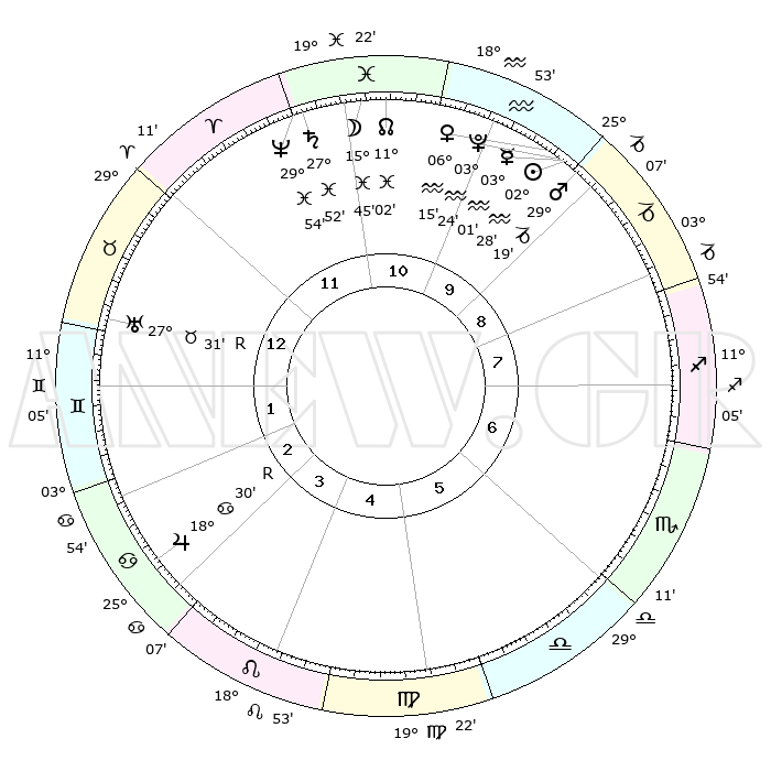 | | ΘΕΣΕΙΣ ΠΛΑΝΗΤΩΝ ΑΣΤΡΟΛΟΓΙΚΟΥ ΧΑΡΤΗ ΤΗΣ ΣΤΙΓΜΗΣ ΑΥΤΗΣ | | | | Πλανήτης | Ζώδιο | Μοίρες | Δεκαήμ. | Σε οίκο | Απόκλιση | | Ακμές των οίκων | | Ηλιος | Υδροχόος | 02°23' | Πρώτο | 10 | 19 S 37 | | 1ος | 08°04' | Ταύρος | | Σελήνη | Ιχθείς | 14°46' | Δεύτερο | 11 | 05 S 33 | | 2ος | 08°06' | Δίδυμοι | | Ερμής | Υδροχόος | 02°54' | Πρώτο | 10 | 21 S 31 | | 3ος | 00°54' | Καρκίνος | | Αφροδίτη | Υδροχόος | 06°09' | Πρώτο | 10 | 19 S 52 | | 4ος | 22°40' | Καρκίνος | | Αρης | Αιγόκερως | 29°15' | Τρίτο | 10 | 21 S 17 | | 5ος | 17°57' | Λέων | | Δίας | Καρκίνος | 18°30'R | Δεύτερο | 3 | 22 N 26 | | 6ος | 22°16' | Παρθένος | | Κρόνος | Ιχθείς | 27°52' | Τρίτο | 12 | 02 S 52 | | 7ος | 08°04' | Σκορπιός | | Ουρανός | Ταύρος | 27°32'R | Τρίτο | 1 | 19 N 25 | | 8ος | 08°06' | Τοξότης | | Ποσειδώνας | Ιχθείς | 29°54' | Τρίτο | 12 | 01 S 15 | | 9ος | 00°54' | Αιγόκερως | | Πλούτωνας | Υδροχόος | 03°24' | Πρώτο | 10 | 23 S 05 | | 10ος | 22°40' | Αιγόκερως | | Β. Δεσμός | Ιχθείς | 11°02' | Δεύτερο | 11 | 07 S 26 | | 11ος | 17°57' | Υδροχόος | | Ωροσκόπος | Ταύρος | 08°04' | Πρώτο | | | 12ος | 22°16' | Ιχθείς | | Μεσουράνημα | Αιγόκερως | 22°40' | Τρίτο | | | |