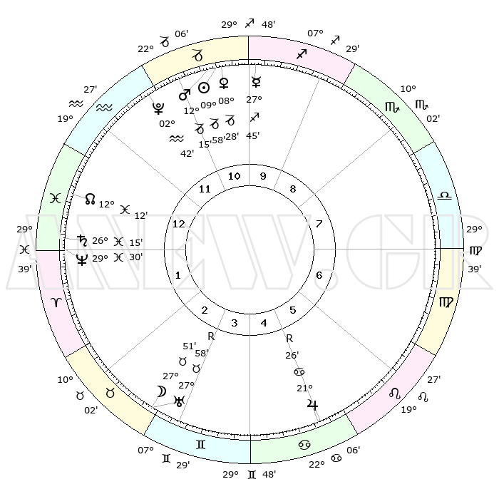 | | ΘΕΣΕΙΣ ΠΛΑΝΗΤΩΝ ΑΣΤΡΟΛΟΓΙΚΟΥ ΧΑΡΤΗ ΤΗΣ ΣΤΙΓΜΗΣ ΑΥΤΗΣ | | | | Πλανήτης | Ζώδιο | Μοίρες | Δεκαήμ. | Σε οίκο | Απόκλιση | | Ακμές των οίκων | | Ηλιος | Αιγόκερως | 09°53' | Πρώτο | 11 | 23 S 04 | | 1ος | 17°19' | Υδροχόος | | Σελήνη | Ταύρος | 26°43' | Τρίτο | 3 | 24 N 11 | | 2ος | 03°06' | Κριός | | Ερμής | Τοξότης | 27°39' | Τρίτο | 11 | 23 S 54 | | 3ος | 08°21' | Ταύρος | | Αφροδίτη | Αιγόκερως | 08°23' | Πρώτο | 11 | 23 S 39 | | 4ος | 04°12' | Δίδυμοι | | Αρης | Αιγόκερως | 12°11' | Δεύτερο | 11 | 23 S 45 | | 5ος | 26°05' | Δίδυμοι | | Δίας | Καρκίνος | 21°26'R | Τρίτο | 6 | 21 N 58 | | 6ος | 18°30' | Καρκίνος | | Κρόνος | Ιχθείς | 26°15' | Τρίτο | 1 | 03 S 34 | | 7ος | 17°19' | Λέων | | Ουρανός | Ταύρος | 27°58'R | Τρίτο | 3 | 19 N 30 | | 8ος | 03°06' | Ζυγός | | Ποσειδώνας | Ιχθείς | 29°30' | Τρίτο | 1 | 01 S 25 | | 9ος | 08°21' | Σκορπιός | | Πλούτωνας | Υδροχόος | 02°42' | Πρώτο | 12 | 23 S 13 | | 10ος | 04°12' | Τοξότης | | Β. Δεσμός | Ιχθείς | 12°12' | Δεύτερο | 1 | 06 S 59 | | 11ος | 26°05' | Τοξότης | | Ωροσκόπος | Υδροχόος | 17°19' | Δεύτερο | | | 12ος | 18°30' | Αιγόκερως | | Μεσουράνημα | Τοξότης | 04°12' | Πρώτο | | | |