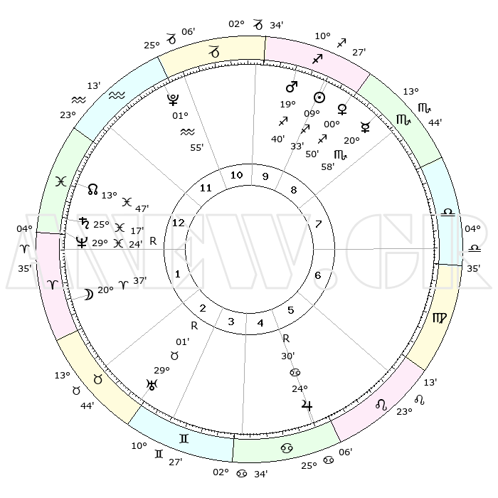 | | ΘΕΣΕΙΣ ΠΛΑΝΗΤΩΝ ΑΣΤΡΟΛΟΓΙΚΟΥ ΧΑΡΤΗ ΤΗΣ ΣΤΙΓΜΗΣ ΑΥΤΗΣ | | | | Πλανήτης | Ζώδιο | Μοίρες | Δεκαήμ. | Σε οίκο | Απόκλιση | | Ακμές των οίκων | | Ηλιος | Τοξότης | 09°30' | Πρώτο | 9 | 21 S 52 | | 1ος | 12°14' | Ιχθείς | | Σελήνη | Κριός | 20°04' | Τρίτο | 1 | 10 N 34 | | 2ος | 26°10' | Κριός | | Ερμής | Σκορπιός | 20°58' | Τρίτο | 8 | 15 S 28 | | 3ος | 26°34' | Ταύρος | | Αφροδίτη | Τοξότης | 00°47' | Πρώτο | 9 | 19 S 38 | | 4ος | 19°54' | Δίδυμοι | | Αρης | Τοξότης | 19°39' | Δεύτερο | 9 | 23 S 42 | | 5ος | 11°40' | Καρκίνος | | Δίας | Καρκίνος | 24°30'R | Τρίτο | 5 | 21 N 22 | | 6ος | 06°37' | Λέων | | Κρόνος | Ιχθείς | 25°17' | Τρίτο | 1 | 04 S 03 | | 7ος | 12°14' | Παρθένος | | Ουρανός | Ταύρος | 29°02'R | Τρίτο | 3 | 19 N 44 | | 8ος | 26°10' | Ζυγός | | Ποσειδώνας | Ιχθείς | 29°24'R | Τρίτο | 1 | 01 S 29 | | 9ος | 26°34' | Σκορπιός | | Πλούτωνας | Υδροχόος | 01°55' | Πρώτο | 11 | 23 S 24 | | 10ος | 19°54' | Τοξότης | | Β. Δεσμός | Ιχθείς | 13°47' | Δεύτερο | 1 | 06 S 23 | | 11ος | 11°40' | Αιγόκερως | | Ωροσκόπος | Ιχθείς | 12°14' | Δεύτερο | | | 12ος | 06°37' | Υδροχόος | | Μεσουράνημα | Τοξότης | 19°54' | Δεύτερο | | | |