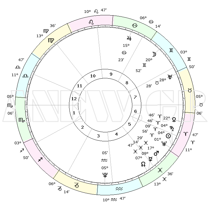 | | ΘΕΣΕΙΣ ΠΛΑΝΗΤΩΝ ΑΣΤΡΟΛΟΓΙΚΟΥ ΧΑΡΤΗ ΤΗΣ ΣΤΙΓΜΗΣ ΑΥΤΗΣ | | | | Πλανήτης | Ζώδιο | Μοίρες | Δεκαήμ. | Σε οίκο | Απόκλιση | | Ακμές των οίκων | | Ηλιος | Κριός | 04°06' | Πρώτο | 6 | 01 N 38 | | 1ος | 16°15' | Ζυγός | | Σελήνη | Δίδυμοι | 19°57' | Δεύτερο | 9 | 28 N 10 | | 2ος | 13°53' | Σκορπιός | | Ερμής | Ιχθείς | 09°13' | Πρώτο | 5 | 08 S 03 | | 3ος | 14°58' | Τοξότης | | Αφροδίτη | Κριός | 22°41' | Τρίτο | 7 | 08 N 09 | | 4ος | 18°23' | Αιγόκερως | | Αρης | Ιχθείς | 17°26' | Δεύτερο | 5 | 05 S 57 | | 5ος | 21°20' | Υδροχόος | | Δίας | Καρκίνος | 15°23' | Δεύτερο | 9 | 22 N 55 | | 6ος | 21°01' | Ιχθείς | | Κρόνος | Κριός | 04°45' | Πρώτο | 6 | 00 S 04 | | 7ος | 16°15' | Κριός | | Ουρανός | Ταύρος | 28°28' | Τρίτο | 8 | 19 N 39 | | 8ος | 13°53' | Ταύρος | | Ποσειδώνας | Κριός | 01°56' | Πρώτο | 6 | 00 S 26 | | 9ος | 14°58' | Δίδυμοι | | Πλούτωνας | Υδροχόος | 05°05' | Πρώτο | 4 | 22 S 48 | | 10ος | 18°23' | Καρκίνος | | Β. Δεσμός | Ιχθείς | 07°47' | Πρώτο | 5 | 08 S 39 | | 11ος | 21°20' | Λέων | | Ωροσκόπος | Ζυγός | 16°15' | Δεύτερο | | | 12ος | 21°01' | Παρθένος | | Μεσουράνημα | Καρκίνος | 18°23' | Δεύτερο | | | |