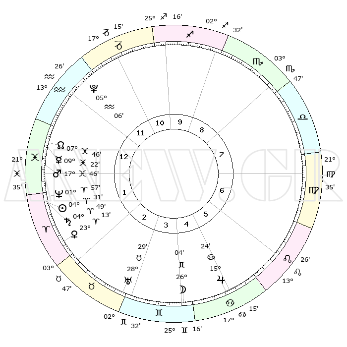 | | ΘΕΣΕΙΣ ΠΛΑΝΗΤΩΝ ΑΣΤΡΟΛΟΓΙΚΟΥ ΧΑΡΤΗ ΤΗΣ ΣΤΙΓΜΗΣ ΑΥΤΗΣ | | | | Πλανήτης | Ζώδιο | Μοίρες | Δεκαήμ. | Σε οίκο | Απόκλιση | | Ακμές των οίκων | | Ηλιος | Κριός | 04°26' | Πρώτο | 2 | 01 N 46 | | 1ος | 07°13' | Υδροχόος | | Σελήνη | Δίδυμοι | 24°52' | Τρίτο | 5 | 28 N 21 | | 2ος | 22°19' | Ιχθείς | | Ερμής | Ιχθείς | 09°20' | Πρώτο | 1 | 08 S 04 | | 3ος | 29°31' | Κριός | | Αφροδίτη | Κριός | 23°07' | Τρίτο | 2 | 08 N 19 | | 4ος | 26°48' | Ταύρος | | Αρης | Ιχθείς | 17°42' | Δεύτερο | 1 | 05 S 50 | | 5ος | 19°07' | Δίδυμοι | | Δίας | Καρκίνος | 15°24' | Δεύτερο | 6 | 22 N 54 | | 6ος | 10°51' | Καρκίνος | | Κρόνος | Κριός | 04°48' | Πρώτο | 2 | 00 S 03 | | 7ος | 07°13' | Λέων | | Ουρανός | Ταύρος | 28°29' | Τρίτο | 4 | 19 N 39 | | 8ος | 22°19' | Παρθένος | | Ποσειδώνας | Κριός | 01°57' | Πρώτο | 2 | 00 S 25 | | 9ος | 29°32' | Ζυγός | | Πλούτωνας | Υδροχόος | 05°06' | Πρώτο | 12 | 22 S 48 | | 10ος | 26°48' | Σκορπιός | | Β. Δεσμός | Ιχθείς | 07°46' | Πρώτο | 1 | 08 S 39 | | 11ος | 19°07' | Τοξότης | | Ωροσκόπος | Υδροχόος | 07°13' | Πρώτο | | | 12ος | 10°51' | Αιγόκερως | | Μεσουράνημα | Σκορπιός | 26°48' | Τρίτο | | | |