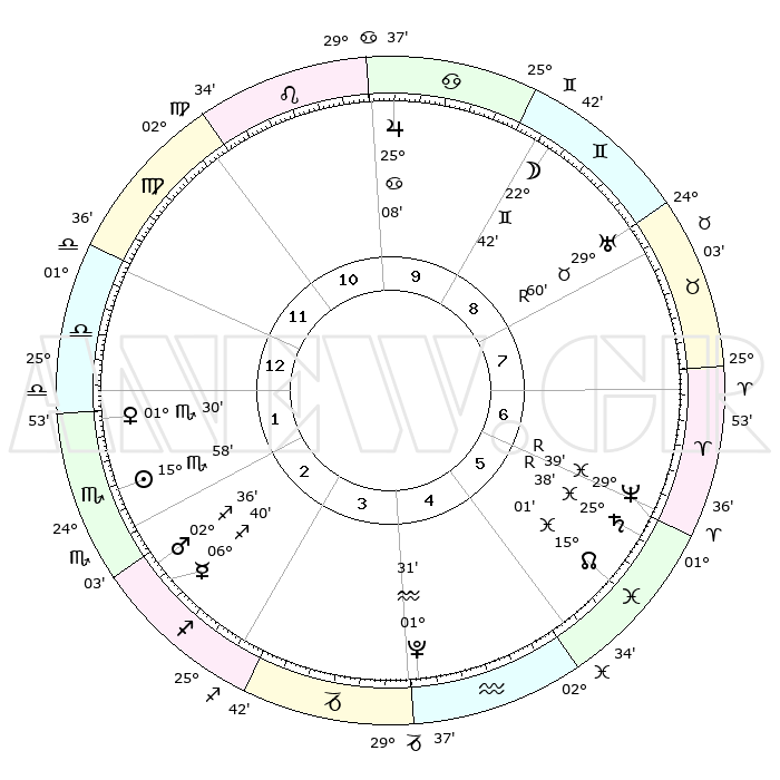 | | ΘΕΣΕΙΣ ΠΛΑΝΗΤΩΝ ΑΣΤΡΟΛΟΓΙΚΟΥ ΧΑΡΤΗ ΤΗΣ ΣΤΙΓΜΗΣ ΑΥΤΗΣ | | | | Πλανήτης | Ζώδιο | Μοίρες | Δεκαήμ. | Σε οίκο | Απόκλιση | | Ακμές των οίκων | | Ηλιος | Σκορπιός | 15°46' | Δεύτερο | 3 | 16 S 33 | | 1ος | 25°21' | Λέων | | Σελήνη | Δίδυμοι | 19°37' | Δεύτερο | 10 | 28 N 04 | | 2ος | 18°43' | Παρθένος | | Ερμής | Τοξότης | 06°37' | Πρώτο | 4 | 23 S 58 | | 3ος | 16°56' | Ζυγός | | Αφροδίτη | Σκορπιός | 01°15' | Πρώτο | 3 | 10 S 38 | | 4ος | 19°47' | Σκορπιός | | Αρης | Τοξότης | 02°27' | Πρώτο | 4 | 21 S 06 | | 5ος | 24°18' | Τοξότης | | Δίας | Καρκίνος | 25°08' | Τρίτο | 11 | 21 N 12 | | 6ος | 26°39' | Αιγόκερως | | Κρόνος | Ιχθείς | 25°39'R | Τρίτο | 8 | 03 S 59 | | 7ος | 25°21' | Υδροχόος | | Ουρανός | Δίδυμοι | 00°00'R | Πρώτο | 10 | 19 N 56 | | 8ος | 18°43' | Ιχθείς | | Ποσειδώνας | Ιχθείς | 29°40'R | Τρίτο | 8 | 01 S 23 | | 9ος | 16°56' | Κριός | | Πλούτωνας | Υδροχόος | 01°31' | Πρώτο | 6 | 23 S 30 | | 10ος | 19°47' | Ταύρος | | Β. Δεσμός | Ιχθείς | 15°02' | Δεύτερο | 7 | 05 S 54 | | 11ος | 24°18' | Δίδυμοι | | Ωροσκόπος | Λέων | 25°21' | Τρίτο | | | 12ος | 26°39' | Καρκίνος | | Μεσουράνημα | Ταύρος | 19°47' | Δεύτερο | | | |