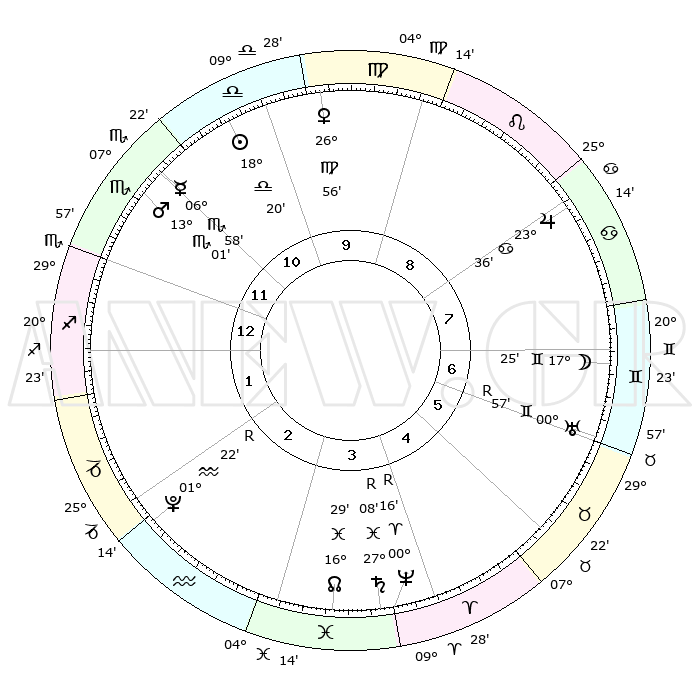 | ΘΕΣΕΙΣ ΠΛΑΝΗΤΩΝ ΑΣΤΡΟΛΟΓΙΚΟΥ ΧΑΡΤΗ ΤΗΣ ΣΤΙΓΜΗΣ ΑΥΤΗΣ | | Πλανήτης | Ζώδιο | Μοίρες | Δεκαήμ. | Σε οίκο | Απόκλιση | | Ακμές των οίκων | Ηλιος | Ζυγός | 18°09' | Δεύτερο | 12 | 07 S 07 | | 1ος | 24°02' | Ζυγός | Σελήνη | Δίδυμοι | 14°38' | Δεύτερο | 8 | 27 N 43 | | 2ος | 22°06' | Σκορπιός | Ερμής | Σκορπιός | 06°41' | Πρώτο | 1 | 14 S 59 | | 3ος | 23°38' | Τοξότης | Αφροδίτη | Παρθένος | 26°41' | Τρίτο | 11 | 02 N 40 | | 4ος | 27°26' | Αιγόκερως | Αρης | Σκορπιός | 12°53' | Δεύτερο | 1 | 15 S 53 | | 5ος | 00°24' | Ιχθείς | Δίας | Καρκίνος | 23°35' | Τρίτο | 9 | 21 N 25 | | 6ος | 29°34' | Ιχθείς | Κρόνος | Ιχθείς | 27°09'R | Τρίτο | 5 | 03 S 26 | | 7ος | 24°02' | Κριός | Ουρανός | Δίδυμοι | 00°58'R | Πρώτο | 8 | 20 N 08 | | 8ος | 22°06' | Ταύρος | Ποσειδώνας | Κριός | 00°16'R | Πρώτο | 6 | 01 S 09 | | 9ος | 23°38' | Δίδυμοι | Πλούτωνας | Υδροχόος | 01°22'R | Πρώτο | 4 | 23 S 32 | | 10ος | 27°26' | Καρκίνος | Β. Δεσμός | Ιχθείς | 16°30' | Δεύτερο | 5 | 05 S 20 | | 11ος | 00°24' | Παρθένος | Ωροσκόπος | Ζυγός | 24°02' | Τρίτο | | | 12ος | 29°34' | Παρθένος | Μεσουράνημα | Καρκίνος | 27°26' | Τρίτο | | | |