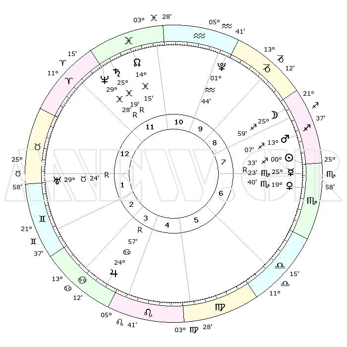 | | ΘΕΣΕΙΣ ΠΛΑΝΗΤΩΝ ΑΣΤΡΟΛΟΓΙΚΟΥ ΧΑΡΤΗ ΤΗΣ ΣΤΙΓΜΗΣ ΑΥΤΗΣ | | | | Πλανήτης | Ζώδιο | Μοίρες | Δεκαήμ. | Σε οίκο | Απόκλιση | | Ακμές των οίκων | | Ηλιος | Τοξότης | 00°30' | Πρώτο | 7 | 20 S 15 | | 1ος | 28°37' | Κριός | | Σελήνη | Τοξότης | 25°19' | Τρίτο | 9 | 28 S 16 | | 2ος | 01°13' | Δίδυμοι | | Ερμής | Σκορπιός | 25°27'R | Τρίτο | 7 | 17 S 55 | | 3ος | 24°55' | Δίδυμοι | | Αφροδίτη | Σκορπιός | 19°36' | Δεύτερο | 7 | 16 S 41 | | 4ος | 16°36' | Καρκίνος | | Αρης | Τοξότης | 13°05' | Δεύτερο | 8 | 22 S 57 | | 5ος | 10°52' | Λέων | | Δίας | Καρκίνος | 24°57'R | Τρίτο | 4 | 21 N 16 | | 6ος | 13°18' | Παρθένος | | Κρόνος | Ιχθείς | 25°19'R | Τρίτο | 12 | 04 S 04 | | 7ος | 28°37' | Ζυγός | | Ουρανός | Ταύρος | 29°24'R | Τρίτο | 1 | 19 N 49 | | 8ος | 01°13' | Τοξότης | | Ποσειδώνας | Ιχθείς | 29°28'R | Τρίτο | 12 | 01 S 28 | | 9ος | 24°55' | Τοξότης | | Πλούτωνας | Υδροχόος | 01°44' | Πρώτο | 10 | 23 S 26 | | 10ος | 16°36' | Αιγόκερως | | Β. Δεσμός | Ιχθείς | 14°15' | Δεύτερο | 12 | 06 S 12 | | 11ος | 10°52' | Υδροχόος | | Ωροσκόπος | Κριός | 28°37' | Τρίτο | | | 12ος | 13°18' | Ιχθείς | | Μεσουράνημα | Αιγόκερως | 16°36' | Δεύτερο | | | |