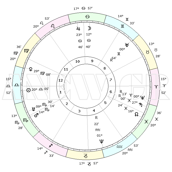 | ΘΕΣΕΙΣ ΠΛΑΝΗΤΩΝ ΑΣΤΡΟΛΟΓΙΚΟΥ ΧΑΡΤΗ ΤΗΣ ΣΤΙΓΜΗΣ ΑΥΤΗΣ | | Πλανήτης | Ζώδιο | Μοίρες | Δεκαήμ. | Σε οίκο | Απόκλιση | | Ακμές των οίκων | Ηλιος | Ζυγός | 19°59' | Δεύτερο | 2 | 07 S 49 | | 1ος | 14°10' | Παρθένος | Σελήνη | Καρκίνος | 11°10' | Δεύτερο | 10 | 27 N 44 | | 2ος | 09°26' | Ζυγός | Ερμής | Σκορπιός | 09°21' | Πρώτο | 3 | 16 S 03 | | 3ος | 09°09' | Σκορπιός | Αφροδίτη | Παρθένος | 28°60' | Τρίτο | 1 | 01 N 46 | | 4ος | 12°05' | Τοξότης | Αρης | Σκορπιός | 14°10' | Δεύτερο | 3 | 16 S 17 | | 5ος | 15°29' | Αιγόκερως | Δίας | Καρκίνος | 23°45' | Τρίτο | 11 | 21 N 23 | | 6ος | 16°34' | Υδροχόος | Κρόνος | Ιχθείς | 27°01'R | Τρίτο | 7 | 03 S 29 | | 7ος | 14°10' | Ιχθείς | Ουρανός | Δίδυμοι | 00°55'R | Πρώτο | 9 | 20 N 08 | | 8ος | 09°26' | Κριός | Ποσειδώνας | Κριός | 00°14'R | Πρώτο | 7 | 01 S 10 | | 9ος | 09°09' | Ταύρος | Πλούτωνας | Υδροχόος | 01°22'R | Πρώτο | 5 | 23 S 32 | | 10ος | 12°05' | Δίδυμοι | Β. Δεσμός | Ιχθείς | 16°24' | Δεύτερο | 7 | 05 S 22 | | 11ος | 15°29' | Καρκίνος | Ωροσκόπος | Παρθένος | 14°10' | Δεύτερο | | | 12ος | 16°34' | Λέων | Μεσουράνημα | Δίδυμοι | 12°05' | Δεύτερο | | | |