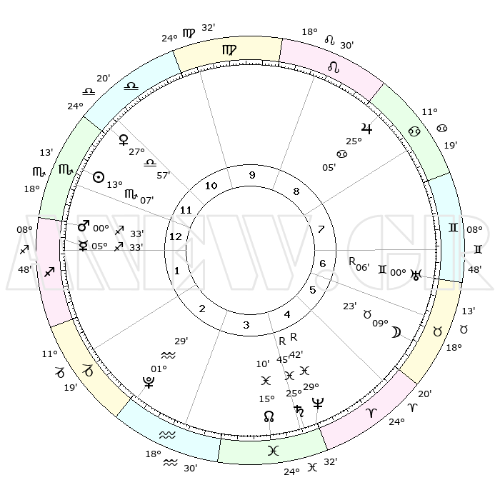 | | ΘΕΣΕΙΣ ΠΛΑΝΗΤΩΝ ΑΣΤΡΟΛΟΓΙΚΟΥ ΧΑΡΤΗ ΤΗΣ ΣΤΙΓΜΗΣ ΑΥΤΗΣ | | | | Πλανήτης | Ζώδιο | Μοίρες | Δεκαήμ. | Σε οίκο | Απόκλιση | | Ακμές των οίκων | | Ηλιος | Σκορπιός | 12°58' | Δεύτερο | 1 | 15 S 44 | | 1ος | 25°55' | Ζυγός | | Σελήνη | Ταύρος | 07°08' | Πρώτο | 7 | 17 N 35 | | 2ος | 24°05' | Σκορπιός | | Ερμής | Τοξότης | 05°28' | Πρώτο | 2 | 23 S 59 | | 3ος | 25°45' | Τοξότης | | Αφροδίτη | Ζυγός | 27°46' | Τρίτο | 1 | 09 S 21 | | 4ος | 29°40' | Αιγόκερως | | Αρης | Τοξότης | 00°27' | Πρώτο | 2 | 20 S 40 | | 5ος | 02°37' | Ιχθείς | | Δίας | Καρκίνος | 25°05' | Τρίτο | 9 | 21 N 12 | | 6ος | 01°38' | Κριός | | Κρόνος | Ιχθείς | 25°45'R | Τρίτο | 5 | 03 S 57 | | 7ος | 25°55' | Κριός | | Ουρανός | Δίδυμοι | 00°07'R | Πρώτο | 8 | 19 N 58 | | 8ος | 24°05' | Ταύρος | | Ποσειδώνας | Ιχθείς | 29°43'R | Τρίτο | 5 | 01 S 22 | | 9ος | 25°45' | Δίδυμοι | | Πλούτωνας | Υδροχόος | 01°29' | Πρώτο | 4 | 23 S 30 | | 10ος | 29°40' | Καρκίνος | | Β. Δεσμός | Ιχθείς | 15°11' | Δεύτερο | 5 | 05 S 50 | | 11ος | 02°37' | Παρθένος | | Ωροσκόπος | Ζυγός | 25°55' | Τρίτο | | | 12ος | 01°38' | Ζυγός | | Μεσουράνημα | Καρκίνος | 29°40' | Τρίτο | | | |