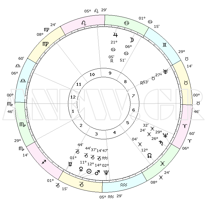 | | ΘΕΣΕΙΣ ΠΛΑΝΗΤΩΝ ΑΣΤΡΟΛΟΓΙΚΟΥ ΧΑΡΤΗ ΤΗΣ ΣΤΙΓΜΗΣ ΑΥΤΗΣ | | | | Πλανήτης | Ζώδιο | Μοίρες | Δεκαήμ. | Σε οίκο | Απόκλιση | | Ακμές των οίκων | | Ηλιος | Αιγόκερως | 12°32' | Δεύτερο | 4 | 22 S 51 | | 1ος | 07°59' | Ζυγός | | Σελήνη | Καρκίνος | 05°41' | Πρώτο | 9 | 27 N 54 | | 2ος | 05°07' | Σκορπιός | | Ερμής | Αιγόκερως | 01°37' | Πρώτο | 3 | 24 S 12 | | 3ος | 05°51' | Τοξότης | | Αφροδίτη | Αιγόκερως | 11°39' | Δεύτερο | 4 | 23 S 30 | | 4ος | 08°59' | Αιγόκερως | | Αρης | Αιγόκερως | 14°11' | Δεύτερο | 4 | 23 S 35 | | 5ος | 11°55' | Υδροχόος | | Δίας | Καρκίνος | 21°06'R | Τρίτο | 10 | 22 N 01 | | 6ος | 12°01' | Ιχθείς | | Κρόνος | Ιχθείς | 26°24' | Τρίτο | 6 | 03 S 30 | | 7ος | 07°59' | Κριός | | Ουρανός | Ταύρος | 27°54'R | Τρίτο | 8 | 19 N 30 | | 8ος | 05°07' | Ταύρος | | Ποσειδώνας | Ιχθείς | 29°32' | Τρίτο | 6 | 01 S 24 | | 9ος | 05°51' | Δίδυμοι | | Πλούτωνας | Υδροχόος | 02°47' | Πρώτο | 4 | 23 S 12 | | 10ος | 08°59' | Καρκίνος | | Β. Δεσμός | Ιχθείς | 12°04' | Δεύτερο | 6 | 07 S 02 | | 11ος | 11°55' | Λέων | | Ωροσκόπος | Ζυγός | 07°59' | Πρώτο | | | 12ος | 12°01' | Παρθένος | | Μεσουράνημα | Καρκίνος | 08°59' | Πρώτο | | | |
