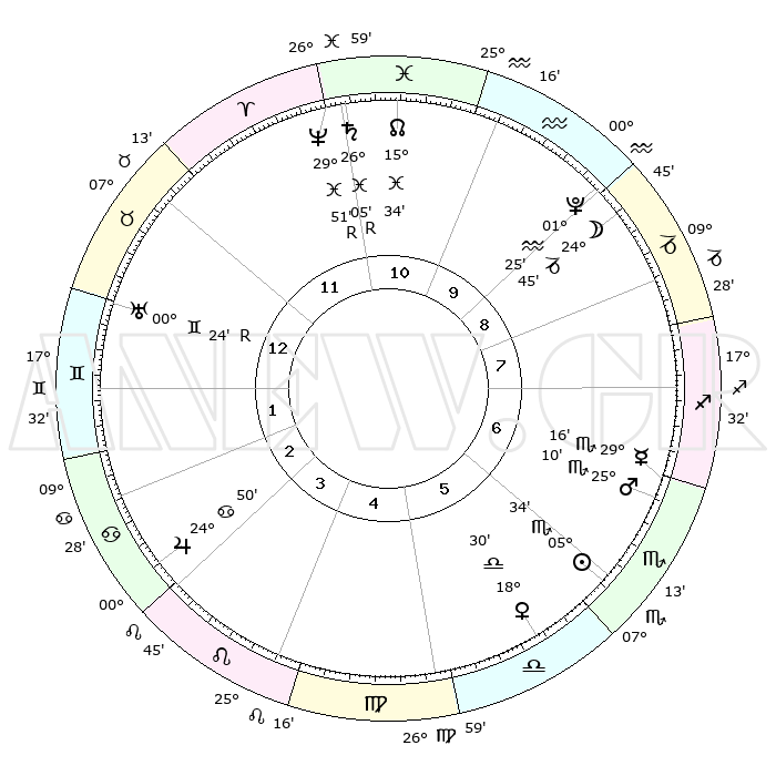 | | ΘΕΣΕΙΣ ΠΛΑΝΗΤΩΝ ΑΣΤΡΟΛΟΓΙΚΟΥ ΧΑΡΤΗ ΤΗΣ ΣΤΙΓΜΗΣ ΑΥΤΗΣ | | | | Πλανήτης | Ζώδιο | Μοίρες | Δεκαήμ. | Σε οίκο | Απόκλιση | | Ακμές των οίκων | | Ηλιος | Σκορπιός | 05°10' | Πρώτο | 11 | 13 S 14 | | 1ος | 16°03' | Τοξότης | | Σελήνη | Αιγόκερως | 19°50' | Δεύτερο | 1 | 26 S 14 | | 2ος | 19°58' | Αιγόκερως | | Ερμής | Σκορπιός | 28°51' | Τρίτο | 12 | 22 S 38 | | 3ος | 28°20' | Υδροχόος | | Αφροδίτη | Ζυγός | 18°00' | Δεύτερο | 10 | 05 S 40 | | 4ος | 03°58' | Κριός | | Αρης | Σκορπιός | 24°53' | Τρίτο | 11 | 19 S 20 | | 5ος | 02°36' | Ταύρος | | Δίας | Καρκίνος | 24°49' | Τρίτο | 8 | 21 N 14 | | 6ος | 25°38' | Ταύρος | | Κρόνος | Ιχθείς | 26°06'R | Τρίτο | 3 | 03 S 49 | | 7ος | 16°03' | Δίδυμοι | | Ουρανός | Δίδυμοι | 00°25'R | Πρώτο | 6 | 20 N 02 | | 8ος | 19°58' | Καρκίνος | | Ποσειδώνας | Ιχθείς | 29°52'R | Τρίτο | 3 | 01 S 19 | | 9ος | 28°20' | Λέων | | Πλούτωνας | Υδροχόος | 01°25' | Πρώτο | 2 | 23 S 31 | | 10ος | 03°58' | Ζυγός | | Β. Δεσμός | Ιχθείς | 15°36' | Δεύτερο | 3 | 05 S 41 | | 11ος | 02°36' | Σκορπιός | | Ωροσκόπος | Τοξότης | 16°03' | Δεύτερο | | | 12ος | 25°38' | Σκορπιός | | Μεσουράνημα | Ζυγός | 03°58' | Πρώτο | | | |