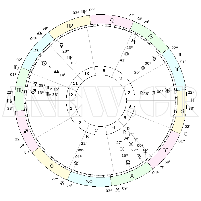 | ΘΕΣΕΙΣ ΠΛΑΝΗΤΩΝ ΑΣΤΡΟΛΟΓΙΚΟΥ ΧΑΡΤΗ ΤΗΣ ΣΤΙΓΜΗΣ ΑΥΤΗΣ | | Πλανήτης | Ζώδιο | Μοίρες | Δεκαήμ. | Σε οίκο | Απόκλιση | | Ακμές των οίκων | Ηλιος | Ζυγός | 19°08' | Δεύτερο | 12 | 07 S 29 | | 1ος | 24°50' | Ζυγός | Σελήνη | Δίδυμοι | 29°04' | Τρίτο | 9 | 28 N 33 | | 2ος | 22°56' | Σκορπιός | Ερμής | Σκορπιός | 08°08' | Πρώτο | 1 | 15 S 34 | | 3ος | 24°31' | Τοξότης | Αφροδίτη | Παρθένος | 27°56' | Τρίτο | 11 | 02 N 11 | | 4ος | 28°23' | Αιγόκερως | Αρης | Σκορπιός | 13°34' | Δεύτερο | 1 | 16 S 06 | | 5ος | 01°20' | Ιχθείς | Δίας | Καρκίνος | 23°41' | Τρίτο | 9 | 21 N 24 | | 6ος | 00°26' | Κριός | Κρόνος | Ιχθείς | 27°04'R | Τρίτο | 5 | 03 S 28 | | 7ος | 24°50' | Κριός | Ουρανός | Δίδυμοι | 00°56'R | Πρώτο | 8 | 20 N 08 | | 8ος | 22°56' | Ταύρος | Ποσειδώνας | Κριός | 00°15'R | Πρώτο | 5 | 01 S 10 | | 9ος | 24°31' | Δίδυμοι | Πλούτωνας | Υδροχόος | 01°22'R | Πρώτο | 4 | 23 S 32 | | 10ος | 28°23' | Καρκίνος | Β. Δεσμός | Ιχθείς | 16°27' | Δεύτερο | 5 | 05 S 21 | | 11ος | 01°20' | Παρθένος | Ωροσκόπος | Ζυγός | 24°50' | Τρίτο | | | 12ος | 00°26' | Ζυγός | Μεσουράνημα | Καρκίνος | 28°23' | Τρίτο | | | |