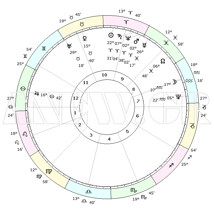 | | ΘΕΣΕΙΣ ΠΛΑΝΗΤΩΝ ΑΣΤΡΟΛΟΓΙΚΟΥ ΧΑΡΤΗ ΤΗΣ ΣΤΙΓΜΗΣ ΑΥΤΗΣ | | | | Πλανήτης | Ζώδιο | Μοίρες | Δεκαήμ. | Σε οίκο | Απόκλιση | | Ακμές των οίκων | | Ηλιος | Κριός | 22°27' | Τρίτο | 10 | 08 N 44 | | 1ος | 08°16' | Καρκίνος | | Σελήνη | Υδροχόος | 16°49' | Δεύτερο | 8 | 17 S 35 | | 2ος | 28°44' | Καρκίνος | | Ερμής | Ιχθείς | 26°12' | Τρίτο | 10 | 03 S 47 | | 3ος | 21°11' | Λέων | | Αφροδίτη | Ταύρος | 15°35' | Δεύτερο | 11 | 16 N 33 | | 4ος | 18°52' | Παρθένος | | Αρης | Κριός | 01°59' | Πρώτο | 10 | 00 S 08 | | 5ος | 23°57' | Ζυγός | | Δίας | Καρκίνος | 16°42' | Δεύτερο | 1 | 22 N 46 | | 6ος | 03°07' | Τοξότης | | Κρόνος | Κριός | 07°04' | Πρώτο | 10 | 00 N 50 | | 7ος | 08°16' | Αιγόκερως | | Ουρανός | Ταύρος | 29°18' | Τρίτο | 11 | 19 N 50 | | 8ος | 28°44' | Αιγόκερως | | Ποσειδώνας | Κριός | 02°38' | Πρώτο | 10 | 00 S 09 | | 9ος | 21°11' | Υδροχόος | | Πλούτωνας | Υδροχόος | 05°22' | Πρώτο | 8 | 22 S 47 | | 10ος | 18°52' | Ιχθείς | | Β. Δεσμός | Ιχθείς | 06°48' | Πρώτο | 9 | 09 S 01 | | 11ος | 23°57' | Κριός | | Ωροσκόπος | Καρκίνος | 08°16' | Πρώτο | | | 12ος | 03°07' | Δίδυμοι | | Μεσουράνημα | Ιχθείς | 18°52' | Δεύτερο | | | |