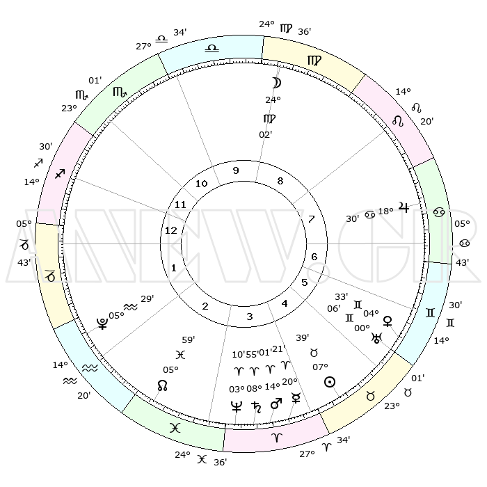 | | ΘΕΣΕΙΣ ΠΛΑΝΗΤΩΝ ΑΣΤΡΟΛΟΓΙΚΟΥ ΧΑΡΤΗ ΤΗΣ ΣΤΙΓΜΗΣ ΑΥΤΗΣ | | | | Πλανήτης | Ζώδιο | Μοίρες | Δεκαήμ. | Σε οίκο | Απόκλιση | | Ακμές των οίκων | | Ηλιος | Ταύρος | 07°35' | Πρώτο | 5 | 14 N 02 | | 1ος | 16°36' | Τοξότης | | Σελήνη | Παρθένος | 23°17' | Τρίτο | 9 | 01 N 23 | | 2ος | 20°38' | Αιγόκερως | | Ερμής | Κριός | 20°15' | Τρίτο | 4 | 05 N 51 | | 3ος | 29°05' | Υδροχόος | | Αφροδίτη | Δίδυμοι | 04°29' | Πρώτο | 6 | 21 N 47 | | 4ος | 04°41' | Κριός | | Αρης | Κριός | 13°58' | Δεύτερο | 4 | 04 N 40 | | 5ος | 03°13' | Ταύρος | | Δίας | Καρκίνος | 18°29' | Δεύτερο | 7 | 22 N 33 | | 6ος | 26°11' | Ταύρος | | Κρόνος | Κριός | 08°54' | Πρώτο | 4 | 01 N 32 | | 7ος | 16°36' | Δίδυμοι | | Ουρανός | Δίδυμοι | 00°06' | Πρώτο | 6 | 20 N 00 | | 8ος | 20°38' | Καρκίνος | | Ποσειδώνας | Κριός | 03°10' | Πρώτο | 3 | 00 N 03 | | 9ος | 29°05' | Λέων | | Πλούτωνας | Υδροχόος | 05°29' | Πρώτο | 2 | 22 S 48 | | 10ος | 04°41' | Ζυγός | | Β. Δεσμός | Ιχθείς | 05°59' | Πρώτο | 3 | 09 S 19 | | 11ος | 03°13' | Σκορπιός | | Ωροσκόπος | Τοξότης | 16°36' | Δεύτερο | | | 12ος | 26°11' | Σκορπιός | | Μεσουράνημα | Ζυγός | 04°41' | Πρώτο | | | |