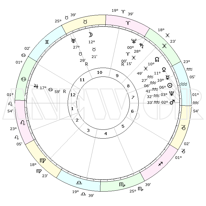 | | ΘΕΣΕΙΣ ΠΛΑΝΗΤΩΝ ΑΣΤΡΟΛΟΓΙΚΟΥ ΧΑΡΤΗ ΤΗΣ ΣΤΙΓΜΗΣ ΑΥΤΗΣ | | | | Πλανήτης | Ζώδιο | Μοίρες | Δεκαήμ. | Σε οίκο | Απόκλιση | | Ακμές των οίκων | | Ηλιος | Υδροχόος | 06°36' | Πρώτο | 8 | 18 S 37 | | 1ος | 11°08' | Καρκίνος | | Σελήνη | Ταύρος | 11°23' | Δεύτερο | 11 | 19 N 36 | | 2ος | 01°33' | Λέων | | Ερμής | Υδροχόος | 09°59' | Πρώτο | 8 | 19 S 44 | | 3ος | 24°18' | Λέων | | Αφροδίτη | Υδροχόος | 11°22' | Δεύτερο | 8 | 18 S 35 | | 4ος | 22°27' | Παρθένος | | Αρης | Υδροχόος | 02°29' | Πρώτο | 8 | 20 S 36 | | 5ος | 27°51' | Ζυγός | | Δίας | Καρκίνος | 17°59'R | Δεύτερο | 1 | 22 N 31 | | 6ος | 06°38' | Τοξότης | | Κρόνος | Ιχθείς | 28°14' | Τρίτο | 10 | 02 S 42 | | 7ος | 11°08' | Αιγόκερως | | Ουρανός | Ταύρος | 27°29'R | Τρίτο | 11 | 19 N 24 | | 8ος | 01°33' | Υδροχόος | | Ποσειδώνας | Ιχθείς | 29°60' | Τρίτο | 10 | 01 S 13 | | 9ος | 24°18' | Υδροχόος | | Πλούτωνας | Υδροχόος | 03°32' | Πρώτο | 8 | 23 S 03 | | 10ος | 22°27' | Ιχθείς | | Β. Δεσμός | Ιχθείς | 10°49' | Δεύτερο | 9 | 07 S 31 | | 11ος | 27°51' | Κριός | | Ωροσκόπος | Καρκίνος | 11°08' | Δεύτερο | | | 12ος | 06°38' | Δίδυμοι | | Μεσουράνημα | Ιχθείς | 22°27' | Τρίτο | | | |