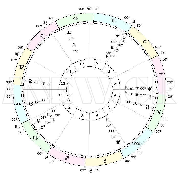 | ΘΕΣΕΙΣ ΠΛΑΝΗΤΩΝ ΑΣΤΡΟΛΟΓΙΚΟΥ ΧΑΡΤΗ ΤΗΣ ΣΤΙΓΜΗΣ ΑΥΤΗΣ | | Πλανήτης | Ζώδιο | Μοίρες | Δεκαήμ. | Σε οίκο | Απόκλιση | | Ακμές των οίκων | Ηλιος | Ζυγός | 16°44' | Δεύτερο | 5 | 06 S 34 | | 1ος | 12°11' | Δίδυμοι | Σελήνη | Ταύρος | 23°25' | Τρίτο | 12 | 23 N 12 | | 2ος | 04°51' | Καρκίνος | Ερμής | Σκορπιός | 04°36' | Πρώτο | 6 | 14 S 08 | | 3ος | 26°03' | Καρκίνος | Αφροδίτη | Παρθένος | 24°55' | Τρίτο | 5 | 03 N 21 | | 4ος | 19°56' | Λέων | Αρης | Σκορπιός | 11°53' | Δεύτερο | 6 | 15 S 34 | | 5ος | 20°38' | Παρθένος | Δίας | Καρκίνος | 23°27' | Τρίτο | 2 | 21 N 26 | | 6ος | 00°33' | Σκορπιός | Κρόνος | Ιχθείς | 27°15'R | Τρίτο | 11 | 03 S 24 | | 7ος | 12°11' | Τοξότης | Ουρανός | Δίδυμοι | 01°00'R | Πρώτο | 12 | 20 N 09 | | 8ος | 04°51' | Αιγόκερως | Ποσειδώνας | Κριός | 00°19'R | Πρώτο | 11 | 01 S 08 | | 9ος | 26°03' | Αιγόκερως | Πλούτωνας | Υδροχόος | 01°22'R | Πρώτο | 9 | 23 S 32 | | 10ος | 19°56' | Υδροχόος | Β. Δεσμός | Ιχθείς | 16°35' | Δεύτερο | 10 | 05 S 18 | | 11ος | 20°38' | Ιχθείς | Ωροσκόπος | Δίδυμοι | 12°11' | Δεύτερο | | | 12ος | 00°33' | Ταύρος | Μεσουράνημα | Υδροχόος | 19°56' | Δεύτερο | | | |