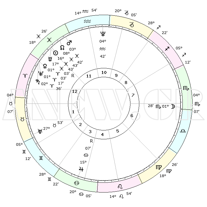 | | ΘΕΣΕΙΣ ΠΛΑΝΗΤΩΝ ΑΣΤΡΟΛΟΓΙΚΟΥ ΧΑΡΤΗ ΤΗΣ ΣΤΙΓΜΗΣ ΑΥΤΗΣ | | | | Πλανήτης | Ζώδιο | Μοίρες | Δεκαήμ. | Σε οίκο | Απόκλιση | | Ακμές των οίκων | | Ηλιος | Ιχθείς | 16°39' | Δεύτερο | 12 | 05 S 16 | | 1ος | 00°41' | Κριός | | Σελήνη | Σκορπιός | 00°45' | Πρώτο | 7 | 15 S 37 | | 2ος | 10°48' | Ταύρος | | Ερμής | Ιχθείς | 17°07'R | Δεύτερο | 12 | 01 S 43 | | 3ος | 08°06' | Δίδυμοι | | Αφροδίτη | Κριός | 00°59' | Πρώτο | 1 | 00 S 45 | | 4ος | 00°23' | Καρκίνος | | Αρης | Ιχθείς | 03°40' | Πρώτο | 12 | 11 S 11 | | 5ος | 22°43' | Καρκίνος | | Δίας | Καρκίνος | 15°07'R | Δεύτερο | 4 | 22 N 56 | | 6ος | 20°13' | Λέων | | Κρόνος | Κριός | 02°35' | Πρώτο | 1 | 00 S 55 | | 7ος | 00°41' | Ζυγός | | Ουρανός | Ταύρος | 27°53' | Τρίτο | 2 | 19 N 31 | | 8ος | 10°48' | Σκορπιός | | Ποσειδώνας | Κριός | 01°17' | Πρώτο | 1 | 00 S 41 | | 9ος | 08°06' | Τοξότης | | Πλούτωνας | Υδροχόος | 04°42' | Πρώτο | 11 | 22 S 51 | | 10ος | 00°23' | Αιγόκερως | | Β. Δεσμός | Ιχθείς | 08°43' | Πρώτο | 12 | 08 S 18 | | 11ος | 22°43' | Αιγόκερως | | Ωροσκόπος | Κριός | 00°41' | Πρώτο | | | 12ος | 20°13' | Υδροχόος | | Μεσουράνημα | Αιγόκερως | 00°23' | Πρώτο | | | |