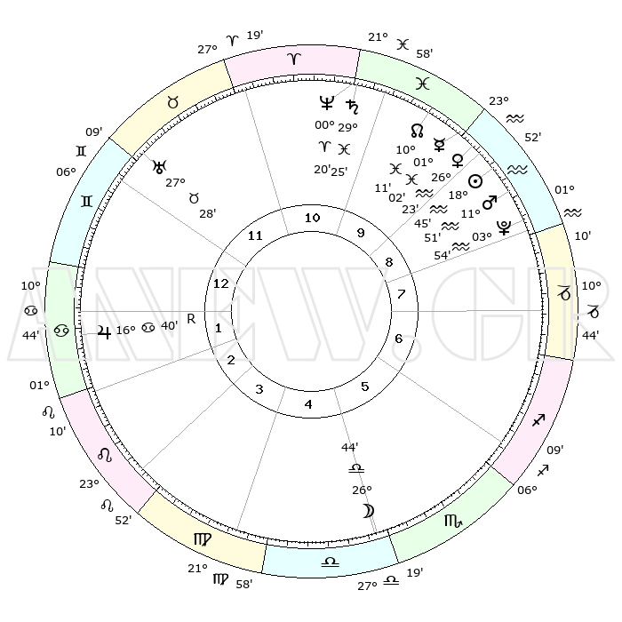 | | ΘΕΣΕΙΣ ΠΛΑΝΗΤΩΝ ΑΣΤΡΟΛΟΓΙΚΟΥ ΧΑΡΤΗ ΤΗΣ ΣΤΙΓΜΗΣ ΑΥΤΗΣ | | | | Πλανήτης | Ζώδιο | Μοίρες | Δεκαήμ. | Σε οίκο | Απόκλιση | | Ακμές των οίκων | | Ηλιος | Υδροχόος | 18°41' | Δεύτερο | 9 | 15 S 13 | | 1ος | 17°18' | Δίδυμοι | | Σελήνη | Ζυγός | 25°52' | Τρίτο | 5 | 13 S 33 | | 2ος | 09°16' | Καρκίνος | | Ερμής | Ιχθείς | 00°55' | Πρώτο | 10 | 12 S 20 | | 3ος | 00°32' | Λέων | | Αφροδίτη | Υδροχόος | 26°18' | Τρίτο | 10 | 14 S 06 | | 4ος | 25°01' | Λέων | | Αρης | Υδροχόος | 11°48' | Δεύτερο | 9 | 18 S 16 | | 5ος | 26°41' | Παρθένος | | Δίας | Καρκίνος | 16°41'R | Δεύτερο | 2 | 22 N 42 | | 6ος | 06°54' | Σκορπιός | | Κρόνος | Ιχθείς | 29°25' | Τρίτο | 11 | 02 S 13 | | 7ος | 17°18' | Τοξότης | | Ουρανός | Ταύρος | 27°28' | Τρίτο | 12 | 19 N 24 | | 8ος | 09°16' | Αιγόκερως | | Ποσειδώνας | Κριός | 00°20' | Πρώτο | 11 | 01 S 04 | | 9ος | 00°32' | Υδροχόος | | Πλούτωνας | Υδροχόος | 03°54' | Πρώτο | 9 | 22 S 59 | | 10ος | 25°01' | Υδροχόος | | Β. Δεσμός | Ιχθείς | 10°11' | Δεύτερο | 10 | 07 S 45 | | 11ος | 26°41' | Ιχθείς | | Ωροσκόπος | Δίδυμοι | 17°18' | Δεύτερο | | | 12ος | 06°54' | Ταύρος | | Μεσουράνημα | Υδροχόος | 25°01' | Τρίτο | | | |