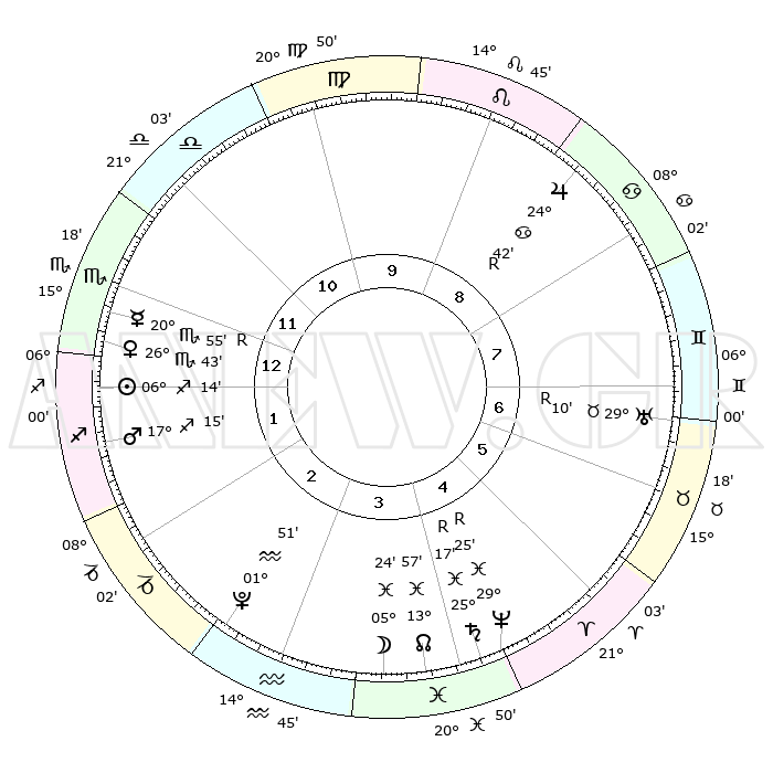 | | ΘΕΣΕΙΣ ΠΛΑΝΗΤΩΝ ΑΣΤΡΟΛΟΓΙΚΟΥ ΧΑΡΤΗ ΤΗΣ ΣΤΙΓΜΗΣ ΑΥΤΗΣ | | | | Πλανήτης | Ζώδιο | Μοίρες | Δεκαήμ. | Σε οίκο | Απόκλιση | | Ακμές των οίκων | | Ηλιος | Τοξότης | 06°12' | Πρώτο | 1 | 21 S 20 | | 1ος | 28°27' | Σκορπιός | | Σελήνη | Ιχθείς | 05°04' | Πρώτο | 3 | 10 S 25 | | 2ος | 29°22' | Τοξότης | | Ερμής | Σκορπιός | 20°56'R | Τρίτο | 12 | 15 S 39 | | 3ος | 04°49' | Υδροχόος | | Αφροδίτη | Σκορπιός | 26°41' | Τρίτο | 12 | 18 S 38 | | 4ος | 10°50' | Ιχθείς | | Αρης | Τοξότης | 17°14' | Δεύτερο | 1 | 23 S 27 | | 5ος | 12°03' | Κριός | | Δίας | Καρκίνος | 24°42'R | Τρίτο | 8 | 21 N 20 | | 6ος | 07°18' | Ταύρος | | Κρόνος | Ιχθείς | 25°17'R | Τρίτο | 4 | 04 S 04 | | 7ος | 28°27' | Ταύρος | | Ουρανός | Ταύρος | 29°10'R | Τρίτο | 7 | 19 N 46 | | 8ος | 29°22' | Δίδυμοι | | Ποσειδώνας | Ιχθείς | 29°25'R | Τρίτο | 4 | 01 S 29 | | 9ος | 04°49' | Λέων | | Πλούτωνας | Υδροχόος | 01°51' | Πρώτο | 2 | 23 S 25 | | 10ος | 10°50' | Παρθένος | | Β. Δεσμός | Ιχθείς | 13°58' | Δεύτερο | 4 | 06 S 19 | | 11ος | 12°03' | Ζυγός | | Ωροσκόπος | Σκορπιός | 28°27' | Τρίτο | | | 12ος | 07°18' | Σκορπιός | | Μεσουράνημα | Παρθένος | 10°50' | Δεύτερο | | | |
