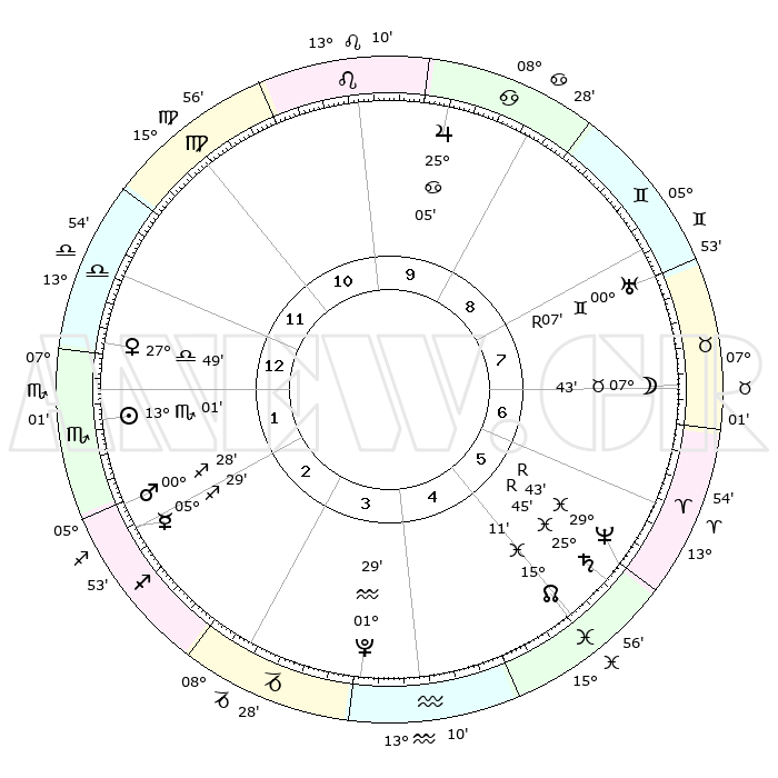 | | ΘΕΣΕΙΣ ΠΛΑΝΗΤΩΝ ΑΣΤΡΟΛΟΓΙΚΟΥ ΧΑΡΤΗ ΤΗΣ ΣΤΙΓΜΗΣ ΑΥΤΗΣ | | | | Πλανήτης | Ζώδιο | Μοίρες | Δεκαήμ. | Σε οίκο | Απόκλιση | | Ακμές των οίκων | | Ηλιος | Σκορπιός | 12°53' | Δεύτερο | 2 | 15 S 42 | | 1ος | 00°49' | Ζυγός | | Σελήνη | Ταύρος | 05°50' | Πρώτο | 8 | 17 N 05 | | 2ος | 27°28' | Ζυγός | | Ερμής | Τοξότης | 05°25' | Πρώτο | 3 | 23 S 58 | | 3ος | 27°56' | Σκορπιός | | Αφροδίτη | Ζυγός | 27°40' | Τρίτο | 2 | 09 S 19 | | 4ος | 00°55' | Αιγόκερως | | Αρης | Τοξότης | 00°23' | Πρώτο | 3 | 20 S 39 | | 5ος | 03°53' | Υδροχόος | | Δίας | Καρκίνος | 25°05' | Τρίτο | 10 | 21 N 12 | | 6ος | 04°17' | Ιχθείς | | Κρόνος | Ιχθείς | 25°45'R | Τρίτο | 6 | 03 S 57 | | 7ος | 00°49' | Κριός | | Ουρανός | Δίδυμοι | 00°07'R | Πρώτο | 9 | 19 N 58 | | 8ος | 27°28' | Κριός | | Ποσειδώνας | Ιχθείς | 29°43'R | Τρίτο | 6 | 01 S 22 | | 9ος | 27°56' | Ταύρος | | Πλούτωνας | Υδροχόος | 01°29' | Πρώτο | 4 | 23 S 30 | | 10ος | 00°55' | Καρκίνος | | Β. Δεσμός | Ιχθείς | 15°11' | Δεύτερο | 6 | 05 S 50 | | 11ος | 03°53' | Λέων | | Ωροσκόπος | Ζυγός | 00°49' | Πρώτο | | | 12ος | 04°17' | Παρθένος | | Μεσουράνημα | Καρκίνος | 00°55' | Πρώτο | | | |