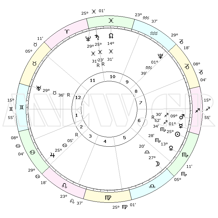 | | ΘΕΣΕΙΣ ΠΛΑΝΗΤΩΝ ΑΣΤΡΟΛΟΓΙΚΟΥ ΧΑΡΤΗ ΤΗΣ ΣΤΙΓΜΗΣ ΑΥΤΗΣ | | | | Πλανήτης | Ζώδιο | Μοίρες | Δεκαήμ. | Σε οίκο | Απόκλιση | | Ακμές των οίκων | | Ηλιος | Σκορπιός | 25°29' | Τρίτο | 7 | 19 S 08 | | 1ος | 09°18' | Ταύρος | | Σελήνη | Ζυγός | 26°19' | Τρίτο | 6 | 13 S 12 | | 2ος | 09°00' | Δίδυμοι | | Ερμής | Τοξότης | 01°58'R | Πρώτο | 7 | 20 S 57 | | 3ος | 01°42' | Καρκίνος | | Αφροδίτη | Σκορπιός | 13°22' | Δεύτερο | 7 | 14 S 46 | | 4ος | 23°30' | Καρκίνος | | Αρης | Τοξότης | 09°27' | Πρώτο | 8 | 22 S 24 | | 5ος | 18°55' | Λέων | | Δίας | Καρκίνος | 25°06'R | Τρίτο | 4 | 21 N 14 | | 6ος | 23°30' | Παρθένος | | Κρόνος | Ιχθείς | 25°23'R | Τρίτο | 12 | 04 S 03 | | 7ος | 09°18' | Σκορπιός | | Ουρανός | Ταύρος | 29°36'R | Τρίτο | 1 | 19 N 51 | | 8ος | 09°00' | Τοξότης | | Ποσειδώνας | Ιχθείς | 29°31'R | Τρίτο | 12 | 01 S 26 | | 9ος | 01°42' | Αιγόκερως | | Πλούτωνας | Υδροχόος | 01°39' | Πρώτο | 10 | 23 S 28 | | 10ος | 23°30' | Αιγόκερως | | Β. Δεσμός | Ιχθείς | 14°31' | Δεύτερο | 11 | 06 S 06 | | 11ος | 18°55' | Υδροχόος | | Ωροσκόπος | Ταύρος | 09°18' | Πρώτο | | | 12ος | 23°30' | Ιχθείς | | Μεσουράνημα | Αιγόκερως | 23°30' | Τρίτο | | | |