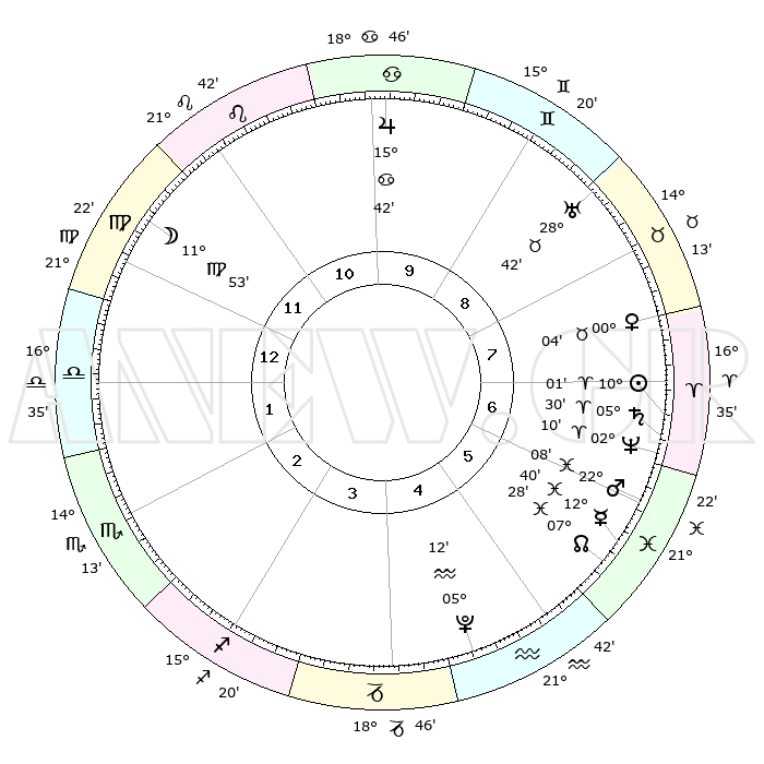 | | ΘΕΣΕΙΣ ΠΛΑΝΗΤΩΝ ΑΣΤΡΟΛΟΓΙΚΟΥ ΧΑΡΤΗ ΤΗΣ ΣΤΙΓΜΗΣ ΑΥΤΗΣ | | | | Πλανήτης | Ζώδιο | Μοίρες | Δεκαήμ. | Σε οίκο | Απόκλιση | | Ακμές των οίκων | | Ηλιος | Κριός | 09°58' | Πρώτο | 7 | 03 N 57 | | 1ος | 01°02' | Ζυγός | | Σελήνη | Παρθένος | 11°12' | Δεύτερο | 12 | 07 N 10 | | 2ος | 27°42' | Ζυγός | | Ερμής | Ιχθείς | 12°38' | Δεύτερο | 6 | 07 S 50 | | 3ος | 28°10' | Σκορπιός | | Αφροδίτη | Ταύρος | 00°01' | Πρώτο | 8 | 11 N 00 | | 4ος | 01°10' | Αιγόκερως | | Αρης | Ιχθείς | 22°05' | Τρίτο | 6 | 04 S 06 | | 5ος | 04°08' | Υδροχόος | | Δίας | Καρκίνος | 15°42' | Δεύτερο | 10 | 22 N 53 | | 6ος | 04°31' | Ιχθείς | | Κρόνος | Κριός | 05°30' | Πρώτο | 7 | 00 N 14 | | 7ος | 01°02' | Κριός | | Ουρανός | Ταύρος | 28°42' | Τρίτο | 9 | 19 N 42 | | 8ος | 27°42' | Κριός | | Ποσειδώνας | Κριός | 02°10' | Πρώτο | 7 | 00 S 20 | | 9ος | 28°10' | Ταύρος | | Πλούτωνας | Υδροχόος | 05°12' | Πρώτο | 5 | 22 S 48 | | 10ος | 01°10' | Καρκίνος | | Β. Δεσμός | Ιχθείς | 07°28' | Πρώτο | 6 | 08 S 46 | | 11ος | 04°08' | Λέων | | Ωροσκόπος | Ζυγός | 01°02' | Πρώτο | | | 12ος | 04°31' | Παρθένος | | Μεσουράνημα | Καρκίνος | 01°10' | Πρώτο | | | |