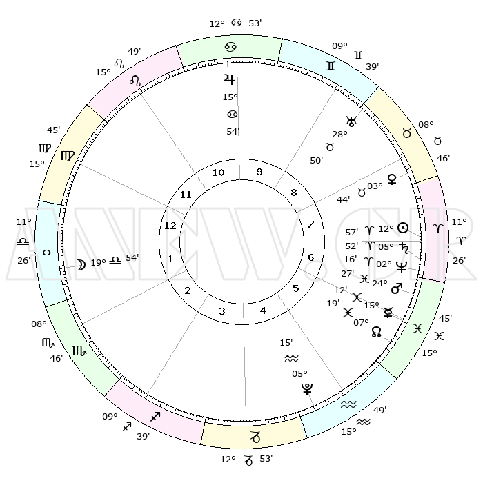 | | ΘΕΣΕΙΣ ΠΛΑΝΗΤΩΝ ΑΣΤΡΟΛΟΓΙΚΟΥ ΧΑΡΤΗ ΤΗΣ ΣΤΙΓΜΗΣ ΑΥΤΗΣ | | | | Πλανήτης | Ζώδιο | Μοίρες | Δεκαήμ. | Σε οίκο | Απόκλιση | | Ακμές των οίκων | | Ηλιος | Κριός | 12°53' | Δεύτερο | 7 | 05 N 05 | | 1ος | 21°59' | Παρθένος | | Σελήνη | Ζυγός | 19°04' | Δεύτερο | 2 | 10 S 35 | | 2ος | 17°57' | Ζυγός | | Ερμής | Ιχθείς | 15°09' | Δεύτερο | 6 | 07 S 17 | | 3ος | 18°03' | Σκορπιός | | Αφροδίτη | Ταύρος | 03°39' | Πρώτο | 8 | 12 N 23 | | 4ος | 20°59' | Τοξότης | | Αρης | Ιχθείς | 24°24' | Τρίτο | 7 | 03 S 11 | | 5ος | 24°06' | Αιγόκερως | | Δίας | Καρκίνος | 15°53' | Δεύτερο | 10 | 22 N 51 | | 6ος | 24°51' | Υδροχόος | | Κρόνος | Κριός | 05°52' | Πρώτο | 7 | 00 N 22 | | 7ος | 21°59' | Ιχθείς | | Ουρανός | Ταύρος | 28°50' | Τρίτο | 9 | 19 N 44 | | 8ος | 17°57' | Κριός | | Ποσειδώνας | Κριός | 02°16' | Πρώτο | 7 | 00 S 18 | | 9ος | 18°03' | Ταύρος | | Πλούτωνας | Υδροχόος | 05°15' | Πρώτο | 5 | 22 S 47 | | 10ος | 20°59' | Δίδυμοι | | Β. Δεσμός | Ιχθείς | 07°19' | Πρώτο | 6 | 08 S 49 | | 11ος | 24°06' | Καρκίνος | | Ωροσκόπος | Παρθένος | 21°59' | Τρίτο | | | 12ος | 24°51' | Λέων | | Μεσουράνημα | Δίδυμοι | 20°59' | Τρίτο | | | |