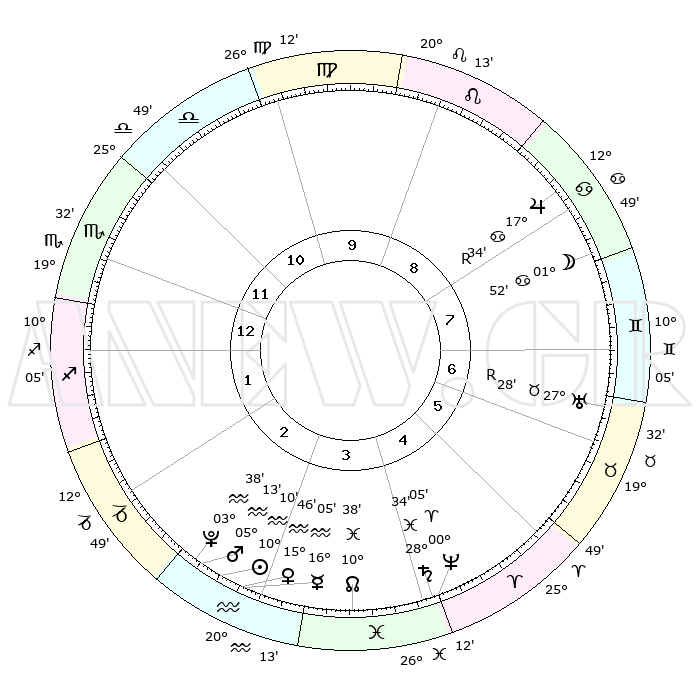 | | ΘΕΣΕΙΣ ΠΛΑΝΗΤΩΝ ΑΣΤΡΟΛΟΓΙΚΟΥ ΧΑΡΤΗ ΤΗΣ ΣΤΙΓΜΗΣ ΑΥΤΗΣ | | | | Πλανήτης | Ζώδιο | Μοίρες | Δεκαήμ. | Σε οίκο | Απόκλιση | | Ακμές των οίκων | | Ηλιος | Υδροχόος | 10°06' | Δεύτερο | 3 | 17 S 43 | | 1ος | 20°55' | Σκορπιός | | Σελήνη | Καρκίνος | 00°54' | Πρώτο | 8 | 28 N 16 | | 2ος | 20°58' | Τοξότης | | Ερμής | Υδροχόος | 15°58' | Δεύτερο | 3 | 17 S 56 | | 3ος | 25°15' | Αιγόκερως | | Αφροδίτη | Υδροχόος | 15°41' | Δεύτερο | 3 | 17 S 24 | | 4ος | 00°54' | Ιχθείς | | Αρης | Υδροχόος | 05°10' | Πρώτο | 3 | 19 S 58 | | 5ος | 02°54' | Κριός | | Δίας | Καρκίνος | 17°35'R | Δεύτερο | 8 | 22 N 35 | | 6ος | 29°11' | Κριός | | Κρόνος | Ιχθείς | 28°34' | Τρίτο | 4 | 02 S 34 | | 7ος | 20°55' | Ταύρος | | Ουρανός | Ταύρος | 27°28'R | Τρίτο | 7 | 19 N 24 | | 8ος | 20°58' | Δίδυμοι | | Ποσειδώνας | Κριός | 00°05' | Πρώτο | 4 | 01 S 10 | | 9ος | 25°15' | Καρκίνος | | Πλούτωνας | Υδροχόος | 03°38' | Πρώτο | 3 | 23 S 02 | | 10ος | 00°54' | Παρθένος | | Β. Δεσμός | Ιχθείς | 10°38' | Δεύτερο | 4 | 07 S 35 | | 11ος | 02°54' | Ζυγός | | Ωροσκόπος | Σκορπιός | 20°55' | Τρίτο | | | 12ος | 29°11' | Ζυγός | | Μεσουράνημα | Παρθένος | 00°54' | Πρώτο | | | |