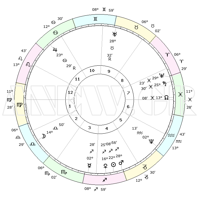 | | ΘΕΣΕΙΣ ΠΛΑΝΗΤΩΝ ΑΣΤΡΟΛΟΓΙΚΟΥ ΧΑΡΤΗ ΤΗΣ ΣΤΙΓΜΗΣ ΑΥΤΗΣ | | | | Πλανήτης | Ζώδιο | Μοίρες | Δεκαήμ. | Σε οίκο | Απόκλιση | | Ακμές των οίκων | | Ηλιος | Τοξότης | 22°02' | Τρίτο | 5 | 23 S 12 | | 1ος | 15°36' | Λέων | | Σελήνη | Ζυγός | 13°46' | Δεύτερο | 3 | 07 S 48 | | 2ος | 07°58' | Παρθένος | | Ερμής | Τοξότης | 02°21' | Πρώτο | 4 | 18 S 58 | | 3ος | 05°05' | Ζυγός | | Αφροδίτη | Τοξότης | 16°19' | Δεύτερο | 5 | 22 S 31 | | 4ος | 07°32' | Σκορπιός | | Αρης | Τοξότης | 28°52' | Τρίτο | 5 | 24 S 12 | | 5ος | 12°46' | Τοξότης | | Δίας | Καρκίνος | 23°29'R | Τρίτο | 12 | 21 N 35 | | 6ος | 16°11' | Αιγόκερως | | Κρόνος | Ιχθείς | 25°30' | Τρίτο | 8 | 03 S 55 | | 7ος | 15°36' | Υδροχόος | | Ουρανός | Ταύρος | 28°32'R | Τρίτο | 10 | 19 N 38 | | 8ος | 07°58' | Ιχθείς | | Ποσειδώνας | Ιχθείς | 29°23' | Τρίτο | 8 | 01 S 29 | | 9ος | 05°05' | Κριός | | Πλούτωνας | Υδροχόος | 02°13' | Πρώτο | 6 | 23 S 20 | | 10ος | 07°32' | Ταύρος | | Β. Δεσμός | Ιχθείς | 13°08' | Δεύτερο | 8 | 06 S 38 | | 11ος | 12°46' | Δίδυμοι | | Ωροσκόπος | Λέων | 15°36' | Δεύτερο | | | 12ος | 16°11' | Καρκίνος | | Μεσουράνημα | Ταύρος | 07°32' | Πρώτο | | | |
