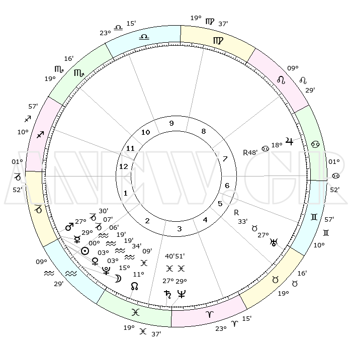 | | ΘΕΣΕΙΣ ΠΛΑΝΗΤΩΝ ΑΣΤΡΟΛΟΓΙΚΟΥ ΧΑΡΤΗ ΤΗΣ ΣΤΙΓΜΗΣ ΑΥΤΗΣ | | | | Πλανήτης | Ζώδιο | Μοίρες | Δεκαήμ. | Σε οίκο | Απόκλιση | | Ακμές των οίκων | | Ηλιος | Αιγόκερως | 29°59' | Τρίτο | 2 | 20 S 09 | | 1ος | 00°21' | Τοξότης | | Σελήνη | Υδροχόος | 14°16' | Δεύτερο | 3 | 18 S 39 | | 2ος | 01°32' | Αιγόκερως | | Ερμής | Αιγόκερως | 28°57' | Τρίτο | 2 | 22 S 20 | | 3ος | 07°18' | Υδροχόος | | Αφροδίτη | Υδροχόος | 03°11' | Πρώτο | 2 | 20 S 32 | | 4ος | 13°21' | Ιχθείς | | Αρης | Αιγόκερως | 27°25' | Τρίτο | 2 | 21 S 39 | | 5ος | 14°21' | Κριός | | Δίας | Καρκίνος | 18°49'R | Δεύτερο | 8 | 22 N 24 | | 6ος | 09°21' | Ταύρος | | Κρόνος | Ιχθείς | 27°40' | Τρίτο | 4 | 02 S 57 | | 7ος | 00°21' | Δίδυμοι | | Ουρανός | Ταύρος | 27°33'R | Τρίτο | 6 | 19 N 25 | | 8ος | 01°32' | Καρκίνος | | Ποσειδώνας | Ιχθείς | 29°51' | Τρίτο | 4 | 01 S 17 | | 9ος | 07°18' | Λέων | | Πλούτωνας | Υδροχόος | 03°19' | Πρώτο | 2 | 23 S 06 | | 10ος | 13°21' | Παρθένος | | Β. Δεσμός | Ιχθείς | 11°10' | Δεύτερο | 3 | 07 S 23 | | 11ος | 14°21' | Ζυγός | | Ωροσκόπος | Τοξότης | 00°21' | Πρώτο | | | 12ος | 09°21' | Σκορπιός | | Μεσουράνημα | Παρθένος | 13°21' | Δεύτερο | | | |