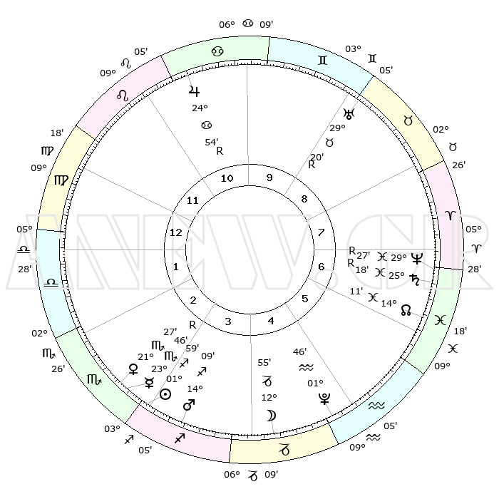 | | ΘΕΣΕΙΣ ΠΛΑΝΗΤΩΝ ΑΣΤΡΟΛΟΓΙΚΟΥ ΧΑΡΤΗ ΤΗΣ ΣΤΙΓΜΗΣ ΑΥΤΗΣ | | | | Πλανήτης | Ζώδιο | Μοίρες | Δεκαήμ. | Σε οίκο | Απόκλιση | | Ακμές των οίκων | | Ηλιος | Τοξότης | 01°58' | Πρώτο | 3 | 20 S 33 | | 1ος | 03°25' | Ζυγός | | Σελήνη | Αιγόκερως | 12°50' | Δεύτερο | 4 | 27 S 13 | | 2ος | 00°15' | Σκορπιός | | Ερμής | Σκορπιός | 23°46'R | Τρίτο | 2 | 17 S 07 | | 3ος | 00°49' | Τοξότης | | Αφροδίτη | Σκορπιός | 21°26' | Τρίτο | 2 | 17 S 12 | | 4ος | 03°51' | Αιγόκερως | | Αρης | Τοξότης | 14°09' | Δεύτερο | 3 | 23 S 06 | | 5ος | 06°47' | Υδροχόος | | Δίας | Καρκίνος | 24°54'R | Τρίτο | 10 | 21 N 17 | | 6ος | 07°05' | Ιχθείς | | Κρόνος | Ιχθείς | 25°18'R | Τρίτο | 6 | 04 S 04 | | 7ος | 03°25' | Κριός | | Ουρανός | Ταύρος | 29°20'R | Τρίτο | 8 | 19 N 48 | | 8ος | 00°15' | Ταύρος | | Ποσειδώνας | Ιχθείς | 29°27'R | Τρίτο | 6 | 01 S 28 | | 9ος | 00°49' | Δίδυμοι | | Πλούτωνας | Υδροχόος | 01°46' | Πρώτο | 4 | 23 S 26 | | 10ος | 03°51' | Καρκίνος | | Β. Δεσμός | Ιχθείς | 14°11' | Δεύτερο | 6 | 06 S 13 | | 11ος | 06°47' | Λέων | | Ωροσκόπος | Ζυγός | 03°25' | Πρώτο | | | 12ος | 07°05' | Παρθένος | | Μεσουράνημα | Καρκίνος | 03°51' | Πρώτο | | | |