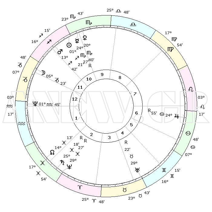 | | ΘΕΣΕΙΣ ΠΛΑΝΗΤΩΝ ΑΣΤΡΟΛΟΓΙΚΟΥ ΧΑΡΤΗ ΤΗΣ ΣΤΙΓΜΗΣ ΑΥΤΗΣ | | | | Πλανήτης | Ζώδιο | Μοίρες | Δεκαήμ. | Σε οίκο | Απόκλιση | | Ακμές των οίκων | | Ηλιος | Τοξότης | 01°17' | Πρώτο | 11 | 20 S 25 | | 1ος | 05°24' | Αιγόκερως | | Σελήνη | Αιγόκερως | 04°31' | Πρώτο | 12 | 28 S 04 | | 2ος | 13°55' | Υδροχόος | | Ερμής | Σκορπιός | 24°32'R | Τρίτο | 11 | 17 S 29 | | 3ος | 24°11' | Ιχθείς | | Αφροδίτη | Σκορπιός | 20°34' | Τρίτο | 10 | 16 S 57 | | 4ος | 27°13' | Κριός | | Αρης | Τοξότης | 13°39' | Δεύτερο | 11 | 23 S 01 | | 5ος | 22°42' | Ταύρος | | Δίας | Καρκίνος | 24°55'R | Τρίτο | 7 | 21 N 17 | | 6ος | 14°12' | Δίδυμοι | | Κρόνος | Ιχθείς | 25°18'R | Τρίτο | 3 | 04 S 04 | | 7ος | 05°24' | Καρκίνος | | Ουρανός | Ταύρος | 29°22'R | Τρίτο | 5 | 19 N 48 | | 8ος | 13°55' | Λέων | | Ποσειδώνας | Ιχθείς | 29°27'R | Τρίτο | 3 | 01 S 28 | | 9ος | 24°11' | Παρθένος | | Πλούτωνας | Υδροχόος | 01°45' | Πρώτο | 1 | 23 S 26 | | 10ος | 27°13' | Ζυγός | | Β. Δεσμός | Ιχθείς | 14°13' | Δεύτερο | 2 | 06 S 13 | | 11ος | 22°42' | Σκορπιός | | Ωροσκόπος | Αιγόκερως | 05°24' | Πρώτο | | | 12ος | 14°12' | Τοξότης | | Μεσουράνημα | Ζυγός | 27°13' | Τρίτο | | | |