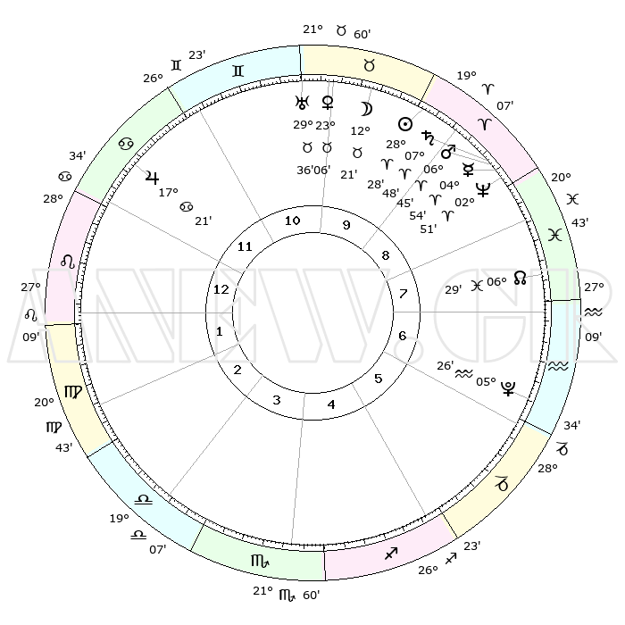| | ΘΕΣΕΙΣ ΠΛΑΝΗΤΩΝ ΑΣΤΡΟΛΟΓΙΚΟΥ ΧΑΡΤΗ ΤΗΣ ΣΤΙΓΜΗΣ ΑΥΤΗΣ | | | | Πλανήτης | Ζώδιο | Μοίρες | Δεκαήμ. | Σε οίκο | Απόκλιση | | Ακμές των οίκων | | Ηλιος | Κριός | 28°25' | Τρίτο | 10 | 10 N 54 | | 1ος | 08°27' | Λέων | | Σελήνη | Ταύρος | 11°24' | Δεύτερο | 10 | 19 N 36 | | 2ος | 00°09' | Παρθένος | | Ερμής | Κριός | 04°48' | Πρώτο | 9 | 00 S 31 | | 3ος | 26°20' | Παρθένος | | Αφροδίτη | Ταύρος | 23°01' | Τρίτο | 10 | 18 N 51 | | 4ος | 28°16' | Ζυγός | | Αρης | Κριός | 06°42' | Πρώτο | 9 | 01 N 46 | | 5ος | 03°58' | Τοξότης | | Δίας | Καρκίνος | 17°20' | Δεύτερο | 12 | 22 N 41 | | 6ος | 08°21' | Αιγόκερως | | Κρόνος | Κριός | 07°48' | Πρώτο | 9 | 01 N 07 | | 7ος | 08°27' | Υδροχόος | | Ουρανός | Ταύρος | 29°36' | Τρίτο | 10 | 19 N 54 | | 8ος | 00°09' | Ιχθείς | | Ποσειδώνας | Κριός | 02°51' | Πρώτο | 9 | 00 S 05 | | 9ος | 26°20' | Ιχθείς | | Πλούτωνας | Υδροχόος | 05°26' | Πρώτο | 6 | 22 S 47 | | 10ος | 28°16' | Κριός | | Β. Δεσμός | Ιχθείς | 06°29' | Πρώτο | 8 | 09 S 08 | | 11ος | 03°58' | Δίδυμοι | | Ωροσκόπος | Λέων | 08°27' | Πρώτο | | | 12ος | 08°21' | Καρκίνος | | Μεσουράνημα | Κριός | 28°16' | Τρίτο | | | |