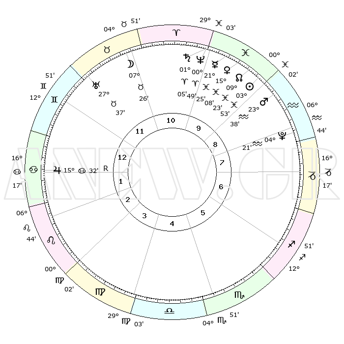 | | ΘΕΣΕΙΣ ΠΛΑΝΗΤΩΝ ΑΣΤΡΟΛΟΓΙΚΟΥ ΧΑΡΤΗ ΤΗΣ ΣΤΙΓΜΗΣ ΑΥΤΗΣ | | | | Πλανήτης | Ζώδιο | Μοίρες | Δεκαήμ. | Σε οίκο | Απόκλιση | | Ακμές των οίκων | | Ηλιος | Ιχθείς | 03°49' | Πρώτο | 10 | 10 S 06 | | 1ος | 23°28' | Δίδυμοι | | Σελήνη | Ταύρος | 06°26' | Πρώτο | 11 | 17 N 52 | | 2ος | 14°46' | Καρκίνος | | Ερμής | Ιχθείς | 21°22' | Τρίτο | 10 | 01 S 42 | | 3ος | 06°13' | Λέων | | Αφροδίτη | Ιχθείς | 15°02' | Δεύτερο | 10 | 07 S 13 | | 4ος | 01°32' | Παρθένος | | Αρης | Υδροχόος | 23°35' | Τρίτο | 9 | 14 S 41 | | 5ος | 04°22' | Ζυγός | | Δίας | Καρκίνος | 15°32'R | Δεύτερο | 2 | 22 N 52 | | 6ος | 14°39' | Σκορπιός | | Κρόνος | Κριός | 01°04' | Πρώτο | 10 | 01 S 32 | | 7ος | 23°28' | Τοξότης | | Ουρανός | Ταύρος | 27°36' | Τρίτο | 12 | 19 N 27 | | 8ος | 14°46' | Αιγόκερως | | Ποσειδώνας | Κριός | 00°49' | Πρώτο | 10 | 00 S 53 | | 9ος | 06°13' | Υδροχόος | | Πλούτωνας | Υδροχόος | 04°21' | Πρώτο | 8 | 22 S 54 | | 10ος | 01°32' | Ιχθείς | | Β. Δεσμός | Ιχθείς | 09°24' | Πρώτο | 10 | 08 S 03 | | 11ος | 04°22' | Κριός | | Ωροσκόπος | Δίδυμοι | 23°28' | Τρίτο | | | 12ος | 14°39' | Ταύρος | | Μεσουράνημα | Ιχθείς | 01°32' | Πρώτο | | | |