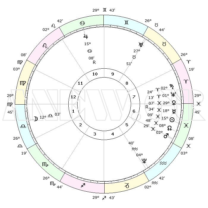 | | ΘΕΣΕΙΣ ΠΛΑΝΗΤΩΝ ΑΣΤΡΟΛΟΓΙΚΟΥ ΧΑΡΤΗ ΤΗΣ ΣΤΙΓΜΗΣ ΑΥΤΗΣ | | | | Πλανήτης | Ζώδιο | Μοίρες | Δεκαήμ. | Σε οίκο | Απόκλιση | | Ακμές των οίκων | | Ηλιος | Ιχθείς | 15°05' | Δεύτερο | 7 | 05 S 52 | | 1ος | 11°08' | Παρθένος | | Σελήνη | Ζυγός | 11°15' | Δεύτερο | 2 | 07 S 03 | | 2ος | 06°08' | Ζυγός | | Ερμής | Ιχθείς | 18°38'R | Δεύτερο | 7 | 01 S 06 | | 3ος | 05°39' | Σκορπιός | | Αφροδίτη | Ιχθείς | 29°02' | Τρίτο | 7 | 01 S 33 | | 4ος | 08°36' | Τοξότης | | Αρης | Ιχθείς | 02°26' | Πρώτο | 6 | 11 S 38 | | 5ος | 12°08' | Αιγόκερως | | Δίας | Καρκίνος | 15°08'R | Δεύτερο | 11 | 22 N 55 | | 6ος | 13°22' | Υδροχόος | | Κρόνος | Κριός | 02°24' | Πρώτο | 7 | 01 S 00 | | 7ος | 11°08' | Ιχθείς | | Ουρανός | Ταύρος | 27°51' | Τρίτο | 9 | 19 N 30 | | 8ος | 06°08' | Κριός | | Ποσειδώνας | Κριός | 01°13' | Πρώτο | 7 | 00 S 43 | | 9ος | 05°39' | Ταύρος | | Πλούτωνας | Υδροχόος | 04°40' | Πρώτο | 5 | 22 S 51 | | 10ος | 08°36' | Δίδυμοι | | Β. Δεσμός | Ιχθείς | 08°48' | Πρώτο | 6 | 08 S 16 | | 11ος | 12°08' | Καρκίνος | | Ωροσκόπος | Παρθένος | 11°08' | Δεύτερο | | | 12ος | 13°22' | Λέων | | Μεσουράνημα | Δίδυμοι | 08°36' | Πρώτο | | | |