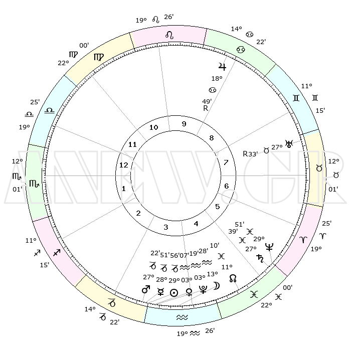 | | ΘΕΣΕΙΣ ΠΛΑΝΗΤΩΝ ΑΣΤΡΟΛΟΓΙΚΟΥ ΧΑΡΤΗ ΤΗΣ ΣΤΙΓΜΗΣ ΑΥΤΗΣ | | | | Πλανήτης | Ζώδιο | Μοίρες | Δεκαήμ. | Σε οίκο | Απόκλιση | | Ακμές των οίκων | | Ηλιος | Αιγόκερως | 29°50' | Τρίτο | 4 | 20 S 11 | | 1ος | 16°19' | Ζυγός | | Σελήνη | Υδροχόος | 12°21' | Δεύτερο | 4 | 19 S 21 | | 2ος | 13°57' | Σκορπιός | | Ερμής | Αιγόκερως | 28°42' | Τρίτο | 4 | 22 S 23 | | 3ος | 15°03' | Τοξότης | | Αφροδίτη | Υδροχόος | 03°00' | Πρώτο | 4 | 20 S 34 | | 4ος | 18°29' | Αιγόκερως | | Αρης | Αιγόκερως | 27°18' | Τρίτο | 4 | 21 S 40 | | 5ος | 21°25' | Υδροχόος | | Δίας | Καρκίνος | 18°50'R | Δεύτερο | 10 | 22 N 23 | | 6ος | 21°06' | Ιχθείς | | Κρόνος | Ιχθείς | 27°39' | Τρίτο | 6 | 02 S 57 | | 7ος | 16°20' | Κριός | | Ουρανός | Ταύρος | 27°33'R | Τρίτο | 8 | 19 N 25 | | 8ος | 13°57' | Ταύρος | | Ποσειδώνας | Ιχθείς | 29°50' | Τρίτο | 6 | 01 S 17 | | 9ος | 15°03' | Δίδυμοι | | Πλούτωνας | Υδροχόος | 03°19' | Πρώτο | 4 | 23 S 06 | | 10ος | 18°28' | Καρκίνος | | Β. Δεσμός | Ιχθείς | 11°10' | Δεύτερο | 5 | 07 S 23 | | 11ος | 21°25' | Λέων | | Ωροσκόπος | Ζυγός | 16°19' | Δεύτερο | | | 12ος | 21°06' | Παρθένος | | Μεσουράνημα | Καρκίνος | 18°28' | Δεύτερο | | | |
