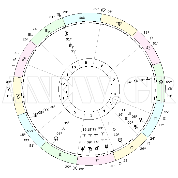 | | ΘΕΣΕΙΣ ΠΛΑΝΗΤΩΝ ΑΣΤΡΟΛΟΓΙΚΟΥ ΧΑΡΤΗ ΤΗΣ ΣΤΙΓΜΗΣ ΑΥΤΗΣ | | | | Πλανήτης | Ζώδιο | Μοίρες | Δεκαήμ. | Σε οίκο | Απόκλιση | | Ακμές των οίκων | | Ηλιος | Ταύρος | 10°31' | Δεύτερο | 5 | 14 N 58 | | 1ος | 23°17' | Τοξότης | | Σελήνη | Σκορπιός | 00°50' | Πρώτο | 10 | 15 S 35 | | 2ος | 28°48' | Αιγόκερως | | Ερμής | Κριός | 25°43' | Τρίτο | 4 | 08 N 08 | | 3ος | 08°09' | Ιχθείς | | Αφροδίτη | Δίδυμοι | 08°08' | Πρώτο | 6 | 22 N 32 | | 4ος | 13°03' | Κριός | | Αρης | Κριός | 16°16' | Δεύτερο | 4 | 05 N 35 | | 5ος | 10°28' | Ταύρος | | Δίας | Καρκίνος | 18°54' | Δεύτερο | 7 | 22 N 29 | | 6ος | 02°47' | Δίδυμοι | | Κρόνος | Κριός | 09°15' | Πρώτο | 3 | 01 N 40 | | 7ος | 23°17' | Δίδυμοι | | Ουρανός | Δίδυμοι | 00°16' | Πρώτο | 5 | 20 N 02 | | 8ος | 28°48' | Καρκίνος | | Ποσειδώνας | Κριός | 03°16' | Πρώτο | 3 | 00 N 05 | | 9ος | 08°09' | Παρθένος | | Πλούτωνας | Υδροχόος | 05°30' | Πρώτο | 2 | 22 S 49 | | 10ος | 13°03' | Ζυγός | | Β. Δεσμός | Ιχθείς | 05°49' | Πρώτο | 2 | 09 S 22 | | 11ος | 10°28' | Σκορπιός | | Ωροσκόπος | Τοξότης | 23°17' | Τρίτο | | | 12ος | 02°47' | Τοξότης | | Μεσουράνημα | Ζυγός | 13°03' | Δεύτερο | | | |