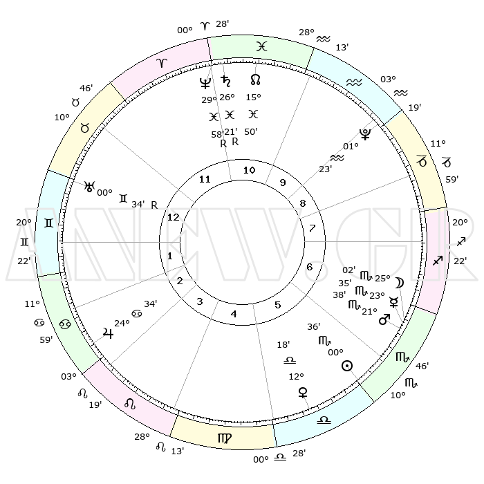 | ΘΕΣΕΙΣ ΠΛΑΝΗΤΩΝ ΑΣΤΡΟΛΟΓΙΚΟΥ ΧΑΡΤΗ ΤΗΣ ΣΤΙΓΜΗΣ ΑΥΤΗΣ | | Πλανήτης | Ζώδιο | Μοίρες | Δεκαήμ. | Σε οίκο | Απόκλιση | | Ακμές των οίκων | Ηλιος | Σκορπιός | 00°26' | Πρώτο | 7 | 11 S 37 | | 1ος | 02°48' | Κριός | Σελήνη | Σκορπιός | 23°07' | Τρίτο | 8 | 23 S 04 | | 2ος | 12°25' | Ταύρος | Ερμής | Σκορπιός | 23°23' | Τρίτο | 8 | 21 S 04 | | 3ος | 09°23' | Δίδυμοι | Αφροδίτη | Ζυγός | 12°05' | Δεύτερο | 7 | 03 S 22 | | 4ος | 01°35' | Καρκίνος | Αρης | Σκορπιός | 21°32' | Τρίτο | 8 | 18 S 26 | | 5ος | 24°01' | Καρκίνος | Δίας | Καρκίνος | 24°34' | Τρίτο | 5 | 21 N 16 | | 6ος | 21°51' | Λέων | Κρόνος | Ιχθείς | 26°21'R | Τρίτο | 12 | 03 S 44 | | 7ος | 02°48' | Ζυγός | Ουρανός | Δίδυμοι | 00°35'R | Πρώτο | 2 | 20 N 04 | | 8ος | 12°25' | Σκορπιός | Ποσειδώνας | Ιχθείς | 29°58'R | Τρίτο | 12 | 01 S 16 | | 9ος | 09°23' | Τοξότης | Πλούτωνας | Υδροχόος | 01°23' | Πρώτο | 11 | 23 S 32 | | 10ος | 01°35' | Αιγόκερως | Β. Δεσμός | Ιχθείς | 15°51' | Δεύτερο | 12 | 05 S 35 | | 11ος | 24°01' | Αιγόκερως | Ωροσκόπος | Κριός | 02°48' | Πρώτο | | | 12ος | 21°51' | Υδροχόος | Μεσουράνημα | Αιγόκερως | 01°35' | Πρώτο | | | |