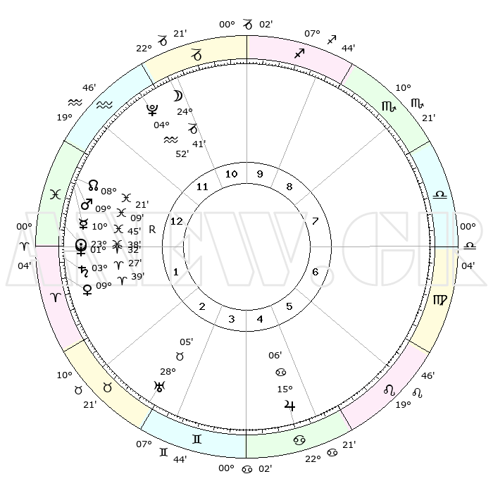 | | ΘΕΣΕΙΣ ΠΛΑΝΗΤΩΝ ΑΣΤΡΟΛΟΓΙΚΟΥ ΧΑΡΤΗ ΤΗΣ ΣΤΙΓΜΗΣ ΑΥΤΗΣ | | | | Πλανήτης | Ζώδιο | Μοίρες | Δεκαήμ. | Σε οίκο | Απόκλιση | | Ακμές των οίκων | | Ηλιος | Ιχθείς | 23°34' | Τρίτο | 1 | 02 S 33 | | 1ος | 27°39' | Υδροχόος | | Σελήνη | Αιγόκερως | 23°59' | Τρίτο | 11 | 24 S 59 | | 2ος | 13°14' | Κριός | | Ερμής | Ιχθείς | 10°47'R | Δεύτερο | 1 | 05 S 06 | | 3ος | 16°25' | Ταύρος | | Αφροδίτη | Κριός | 09°35' | Πρώτο | 1 | 02 N 49 | | 4ος | 11°03' | Δίδυμοι | | Αρης | Ιχθείς | 09°07' | Πρώτο | 1 | 09 S 10 | | 5ος | 02°45' | Καρκίνος | | Δίας | Καρκίνος | 15°06' | Δεύτερο | 5 | 22 N 56 | | 6ος | 26°05' | Καρκίνος | | Κρόνος | Κριός | 03°26' | Πρώτο | 1 | 00 S 35 | | 7ος | 27°39' | Λέων | | Ουρανός | Ταύρος | 28°05' | Τρίτο | 3 | 19 N 33 | | 8ος | 13°14' | Ζυγός | | Ποσειδώνας | Κριός | 01°32' | Πρώτο | 1 | 00 S 35 | | 9ος | 16°25' | Σκορπιός | | Πλούτωνας | Υδροχόος | 04°52' | Πρώτο | 12 | 22 S 50 | | 10ος | 11°03' | Τοξότης | | Β. Δεσμός | Ιχθείς | 08°21' | Πρώτο | 1 | 08 S 26 | | 11ος | 02°45' | Αιγόκερως | | Ωροσκόπος | Υδροχόος | 27°39' | Τρίτο | | | 12ος | 26°05' | Αιγόκερως | | Μεσουράνημα | Τοξότης | 11°03' | Δεύτερο | | | |