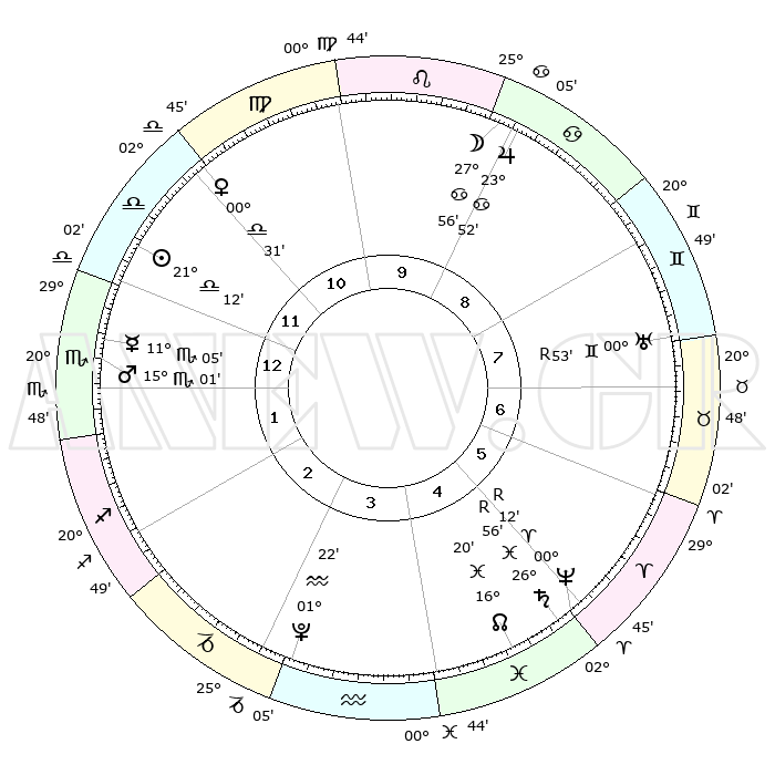 | ΘΕΣΕΙΣ ΠΛΑΝΗΤΩΝ ΑΣΤΡΟΛΟΓΙΚΟΥ ΧΑΡΤΗ ΤΗΣ ΣΤΙΓΜΗΣ ΑΥΤΗΣ | | Πλανήτης | Ζώδιο | Μοίρες | Δεκαήμ. | Σε οίκο | Απόκλιση | | Ακμές των οίκων | Ηλιος | Ζυγός | 21°04' | Τρίτο | 1 | 08 S 13 | | 1ος | 14°25' | Ζυγός | Σελήνη | Καρκίνος | 26°15' | Τρίτο | 10 | 24 N 55 | | 2ος | 11°57' | Σκορπιός | Ερμής | Σκορπιός | 10°54' | Δεύτερο | 1 | 16 S 39 | | 3ος | 12°57' | Τοξότης | Αφροδίτη | Ζυγός | 00°22' | Πρώτο | 12 | 01 N 14 | | 4ος | 16°18' | Αιγόκερως | Αρης | Σκορπιός | 14°56' | Δεύτερο | 2 | 16 S 31 | | 5ος | 19°14' | Υδροχόος | Δίας | Καρκίνος | 23°51' | Τρίτο | 10 | 21 N 22 | | 6ος | 19°01' | Ιχθείς | Κρόνος | Ιχθείς | 26°57'R | Τρίτο | 6 | 03 S 31 | | 7ος | 14°25' | Κριός | Ουρανός | Δίδυμοι | 00°53'R | Πρώτο | 8 | 20 N 07 | | 8ος | 11°57' | Ταύρος | Ποσειδώνας | Κριός | 00°12'R | Πρώτο | 6 | 01 S 11 | | 9ος | 12°57' | Δίδυμοι | Πλούτωνας | Υδροχόος | 01°22' | Πρώτο | 4 | 23 S 32 | | 10ος | 16°18' | Καρκίνος | Β. Δεσμός | Ιχθείς | 16°21' | Δεύτερο | 5 | 05 S 23 | | 11ος | 19°14' | Λέων | Ωροσκόπος | Ζυγός | 14°25' | Δεύτερο | | | 12ος | 19°01' | Παρθένος | Μεσουράνημα | Καρκίνος | 16°18' | Δεύτερο | | | |