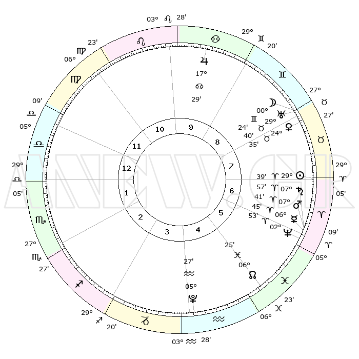 | | ΘΕΣΕΙΣ ΠΛΑΝΗΤΩΝ ΑΣΤΡΟΛΟΓΙΚΟΥ ΧΑΡΤΗ ΤΗΣ ΣΤΙΓΜΗΣ ΑΥΤΗΣ | | | | Πλανήτης | Ζώδιο | Μοίρες | Δεκαήμ. | Σε οίκο | Απόκλιση | | Ακμές των οίκων | | Ηλιος | Κριός | 29°35' | Τρίτο | 7 | 11 N 19 | | 1ος | 08°57' | Ζυγός | | Σελήνη | Ταύρος | 29°22' | Τρίτο | 8 | 24 N 56 | | 2ος | 06°08' | Σκορπιός | | Ερμής | Κριός | 06°38' | Πρώτο | 6 | 00 N 13 | | 3ος | 06°55' | Τοξότης | | Αφροδίτη | Ταύρος | 24°30' | Τρίτο | 8 | 19 N 16 | | 4ος | 10°04' | Αιγόκερως | | Αρης | Κριός | 07°38' | Πρώτο | 6 | 02 N 09 | | 5ος | 12°60' | Υδροχόος | | Δίας | Καρκίνος | 17°28' | Δεύτερο | 10 | 22 N 40 | | 6ος | 13°03' | Ιχθείς | | Κρόνος | Κριός | 07°57' | Πρώτο | 6 | 01 N 10 | | 7ος | 08°57' | Κριός | | Ουρανός | Ταύρος | 29°40' | Τρίτο | 8 | 19 N 55 | | 8ος | 06°08' | Ταύρος | | Ποσειδώνας | Κριός | 02°53' | Πρώτο | 6 | 00 S 03 | | 9ος | 06°55' | Δίδυμοι | | Πλούτωνας | Υδροχόος | 05°27' | Πρώτο | 4 | 22 S 48 | | 10ος | 10°04' | Καρκίνος | | Β. Δεσμός | Ιχθείς | 06°25' | Πρώτο | 5 | 09 S 09 | | 11ος | 12°60' | Λέων | | Ωροσκόπος | Ζυγός | 08°57' | Πρώτο | | | 12ος | 13°03' | Παρθένος | | Μεσουράνημα | Καρκίνος | 10°04' | Δεύτερο | | | |