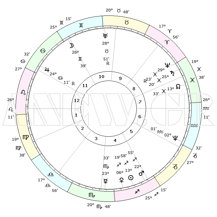 | | ΘΕΣΕΙΣ ΠΛΑΝΗΤΩΝ ΑΣΤΡΟΛΟΓΙΚΟΥ ΧΑΡΤΗ ΤΗΣ ΣΤΙΓΜΗΣ ΑΥΤΗΣ | | | | Πλανήτης | Ζώδιο | Μοίρες | Δεκαήμ. | Σε οίκο | Απόκλιση | | Ακμές των οίκων | | Ηλιος | Τοξότης | 13°55' | Δεύτερο | 5 | 22 S 28 | | 1ος | 12°54' | Λέων | | Σελήνη | Δίδυμοι | 25°58' | Τρίτο | 11 | 28 N 15 | | 2ος | 05°00' | Παρθένος | | Ερμής | Σκορπιός | 23°31' | Τρίτο | 4 | 16 S 14 | | 3ος | 01°47' | Ζυγός | | Αφροδίτη | Τοξότης | 06°16' | Πρώτο | 4 | 20 S 50 | | 4ος | 04°04' | Σκορπιός | | Αρης | Τοξότης | 22°53' | Τρίτο | 5 | 23 S 57 | | 5ος | 09°29' | Τοξότης | | Δίας | Καρκίνος | 24°12'R | Τρίτο | 12 | 21 N 26 | | 6ος | 13°14' | Αιγόκερως | | Κρόνος | Ιχθείς | 25°20' | Τρίτο | 8 | 04 S 01 | | 7ος | 12°54' | Υδροχόος | | Ουρανός | Ταύρος | 28°51'R | Τρίτο | 10 | 19 N 42 | | 8ος | 05°00' | Ιχθείς | | Ποσειδώνας | Ιχθείς | 29°23'R | Τρίτο | 8 | 01 S 29 | | 9ος | 01°47' | Κριός | | Πλούτωνας | Υδροχόος | 02°01' | Πρώτο | 6 | 23 S 23 | | 10ος | 04°04' | Ταύρος | | Β. Δεσμός | Ιχθείς | 13°33' | Δεύτερο | 8 | 06 S 28 | | 11ος | 09°29' | Δίδυμοι | | Ωροσκόπος | Λέων | 12°54' | Δεύτερο | | | 12ος | 13°14' | Καρκίνος | | Μεσουράνημα | Ταύρος | 04°04' | Πρώτο | | | |