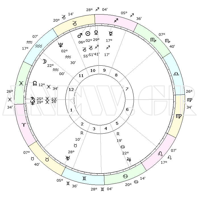 | | ΘΕΣΕΙΣ ΠΛΑΝΗΤΩΝ ΑΣΤΡΟΛΟΓΙΚΟΥ ΧΑΡΤΗ ΤΗΣ ΣΤΙΓΜΗΣ ΑΥΤΗΣ | | | | Πλανήτης | Ζώδιο | Μοίρες | Δεκαήμ. | Σε οίκο | Απόκλιση | | Ακμές των οίκων | | Ηλιος | Αιγόκερως | 02°44' | Πρώτο | 11 | 23 S 24 | | 1ος | 29°40' | Αιγόκερως | | Σελήνη | Υδροχόος | 20°37' | Τρίτο | 1 | 16 S 19 | | 2ος | 13°42' | Ιχθείς | | Ερμής | Τοξότης | 17°07' | Δεύτερο | 11 | 22 S 28 | | 3ος | 22°12' | Κριός | | Αφροδίτη | Τοξότης | 29°32' | Τρίτο | 11 | 23 S 38 | | 4ος | 20°44' | Ταύρος | | Αρης | Αιγόκερως | 06°49' | Πρώτο | 12 | 24 S 06 | | 5ος | 13°31' | Δίδυμοι | | Δίας | Καρκίνος | 22°19'R | Τρίτο | 6 | 21 N 48 | | 6ος | 04°55' | Καρκίνος | | Κρόνος | Ιχθείς | 25°53' | Τρίτο | 2 | 03 S 44 | | 7ος | 29°40' | Καρκίνος | | Ουρανός | Ταύρος | 28°10'R | Τρίτο | 4 | 19 N 33 | | 8ος | 13°42' | Παρθένος | | Ποσειδώνας | Ιχθείς | 29°26' | Τρίτο | 2 | 01 S 27 | | 9ος | 22°12' | Ζυγός | | Πλούτωνας | Υδροχόος | 02°30' | Πρώτο | 1 | 23 S 16 | | 10ος | 20°44' | Σκορπιός | | Β. Δεσμός | Ιχθείς | 12°35' | Δεύτερο | 1 | 06 S 50 | | 11ος | 13°31' | Τοξότης | | Ωροσκόπος | Αιγόκερως | 29°40' | Τρίτο | | | 12ος | 04°55' | Αιγόκερως | | Μεσουράνημα | Σκορπιός | 20°44' | Τρίτο | | | |