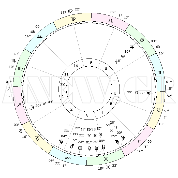| | ΘΕΣΕΙΣ ΠΛΑΝΗΤΩΝ ΑΣΤΡΟΛΟΓΙΚΟΥ ΧΑΡΤΗ ΤΗΣ ΣΤΙΓΜΗΣ ΑΥΤΗΣ | | | | Πλανήτης | Ζώδιο | Μοίρες | Δεκαήμ. | Σε οίκο | Απόκλιση | | Ακμές των οίκων | | Ηλιος | Υδροχόος | 23°13' | Τρίτο | 4 | 13 S 47 | | 1ος | 14°07' | Σκορπιός | | Σελήνη | Τοξότης | 19°25' | Δεύτερο | 2 | 28 S 10 | | 2ος | 13°31' | Τοξότης | | Ερμής | Ιχθείς | 08°31' | Πρώτο | 4 | 08 S 54 | | 3ος | 16°53' | Αιγόκερως | | Αφροδίτη | Ιχθείς | 01°54' | Πρώτο | 4 | 12 S 10 | | 4ος | 22°06' | Υδροχόος | | Αρης | Υδροχόος | 15°19' | Δεύτερο | 3 | 17 S 16 | | 5ος | 24°34' | Ιχθείς | | Δίας | Καρκίνος | 16°16'R | Δεύτερο | 8 | 22 N 46 | | 6ος | 21°43' | Κριός | | Κρόνος | Ιχθείς | 29°53' | Τρίτο | 5 | 02 S 01 | | 7ος | 14°07' | Ταύρος | | Ουρανός | Ταύρος | 27°29' | Τρίτο | 7 | 19 N 25 | | 8ος | 13°31' | Δίδυμοι | | Ποσειδώνας | Κριός | 00°28' | Πρώτο | 5 | 01 S 01 | | 9ος | 16°53' | Καρκίνος | | Πλούτωνας | Υδροχόος | 04°03' | Πρώτο | 3 | 22 S 57 | | 10ος | 22°06' | Λέων | | Β. Δεσμός | Ιχθείς | 09°57' | Πρώτο | 4 | 07 S 50 | | 11ος | 24°34' | Παρθένος | | Ωροσκόπος | Σκορπιός | 14°07' | Δεύτερο | | | 12ος | 21°43' | Ζυγός | | Μεσουράνημα | Λέων | 22°06' | Τρίτο | | | |