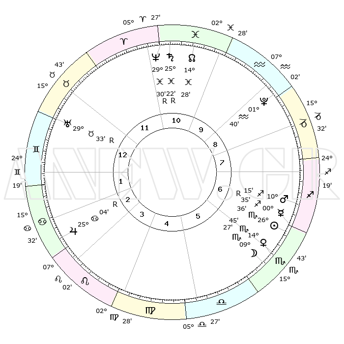 | | ΘΕΣΕΙΣ ΠΛΑΝΗΤΩΝ ΑΣΤΡΟΛΟΓΙΚΟΥ ΧΑΡΤΗ ΤΗΣ ΣΤΙΓΜΗΣ ΑΥΤΗΣ | | | | Πλανήτης | Ζώδιο | Μοίρες | Δεκαήμ. | Σε οίκο | Απόκλιση | | Ακμές των οίκων | | Ηλιος | Σκορπιός | 26°33' | Τρίτο | 6 | 19 S 23 | | 1ος | 03°10' | Δίδυμοι | | Σελήνη | Σκορπιός | 08°47' | Πρώτο | 6 | 18 S 14 | | 2ος | 27°21' | Δίδυμοι | | Ερμής | Τοξότης | 00°39'R | Πρώτο | 6 | 20 S 20 | | 3ος | 18°40' | Καρκίνος | | Αφροδίτη | Σκορπιός | 14°41' | Δεύτερο | 6 | 15 S 11 | | 4ος | 11°41' | Λέων | | Αρης | Τοξότης | 10°13' | Δεύτερο | 7 | 22 S 31 | | 5ος | 10°42' | Παρθένος | | Δίας | Καρκίνος | 25°04'R | Τρίτο | 3 | 21 N 14 | | 6ος | 19°37' | Ζυγός | | Κρόνος | Ιχθείς | 25°22'R | Τρίτο | 11 | 04 S 03 | | 7ος | 03°10' | Τοξότης | | Ουρανός | Ταύρος | 29°34'R | Τρίτο | 12 | 19 N 51 | | 8ος | 27°21' | Τοξότης | | Ποσειδώνας | Ιχθείς | 29°30'R | Τρίτο | 11 | 01 S 27 | | 9ος | 18°40' | Αιγόκερως | | Πλούτωνας | Υδροχόος | 01°40' | Πρώτο | 9 | 23 S 27 | | 10ος | 11°41' | Υδροχόος | | Β. Δεσμός | Ιχθείς | 14°28' | Δεύτερο | 11 | 06 S 07 | | 11ος | 10°42' | Ιχθείς | | Ωροσκόπος | Δίδυμοι | 03°10' | Πρώτο | | | 12ος | 19°37' | Κριός | | Μεσουράνημα | Υδροχόος | 11°41' | Δεύτερο | | | |