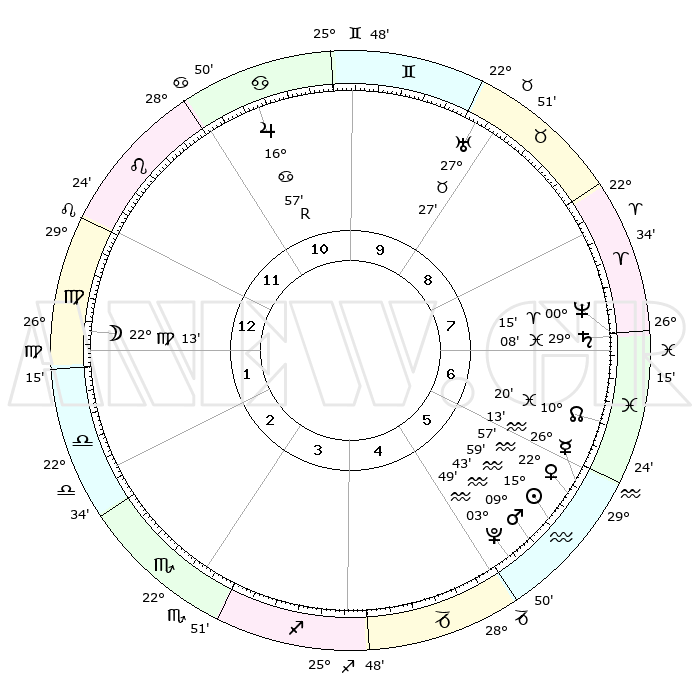 | | ΘΕΣΕΙΣ ΠΛΑΝΗΤΩΝ ΑΣΤΡΟΛΟΓΙΚΟΥ ΧΑΡΤΗ ΤΗΣ ΣΤΙΓΜΗΣ ΑΥΤΗΣ | | | | Πλανήτης | Ζώδιο | Μοίρες | Δεκαήμ. | Σε οίκο | Απόκλιση | | Ακμές των οίκων | | Ηλιος | Υδροχόος | 15°54' | Δεύτερο | 6 | 16 S 04 | | 1ος | 04°02' | Παρθένος | | Σελήνη | Παρθένος | 21°13' | Τρίτο | 1 | 02 N 28 | | 2ος | 28°18' | Παρθένος | | Ερμής | Υδροχόος | 26°05' | Τρίτο | 6 | 14 S 19 | | 3ος | 27°19' | Ζυγός | | Αφροδίτη | Υδροχόος | 22°51' | Τρίτο | 6 | 15 S 14 | | 4ος | 00°16' | Τοξότης | | Αρης | Υδροχόος | 09°39' | Πρώτο | 6 | 18 S 51 | | 5ος | 04°12' | Αιγόκερως | | Δίας | Καρκίνος | 16°57'R | Δεύτερο | 11 | 22 N 40 | | 6ος | 05°51' | Υδροχόος | | Κρόνος | Ιχθείς | 29°08' | Τρίτο | 8 | 02 S 20 | | 7ος | 04°02' | Ιχθείς | | Ουρανός | Ταύρος | 27°27' | Τρίτο | 9 | 19 N 24 | | 8ος | 28°18' | Ιχθείς | | Ποσειδώνας | Κριός | 00°15' | Πρώτο | 8 | 01 S 06 | | 9ος | 27°19' | Κριός | | Πλούτωνας | Υδροχόος | 03°49' | Πρώτο | 5 | 23 S 00 | | 10ος | 00°16' | Δίδυμοι | | Β. Δεσμός | Ιχθείς | 10°20' | Δεύτερο | 7 | 07 S 42 | | 11ος | 04°12' | Καρκίνος | | Ωροσκόπος | Παρθένος | 04°02' | Πρώτο | | | 12ος | 05°51' | Λέων | | Μεσουράνημα | Δίδυμοι | 00°16' | Πρώτο | | | |